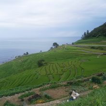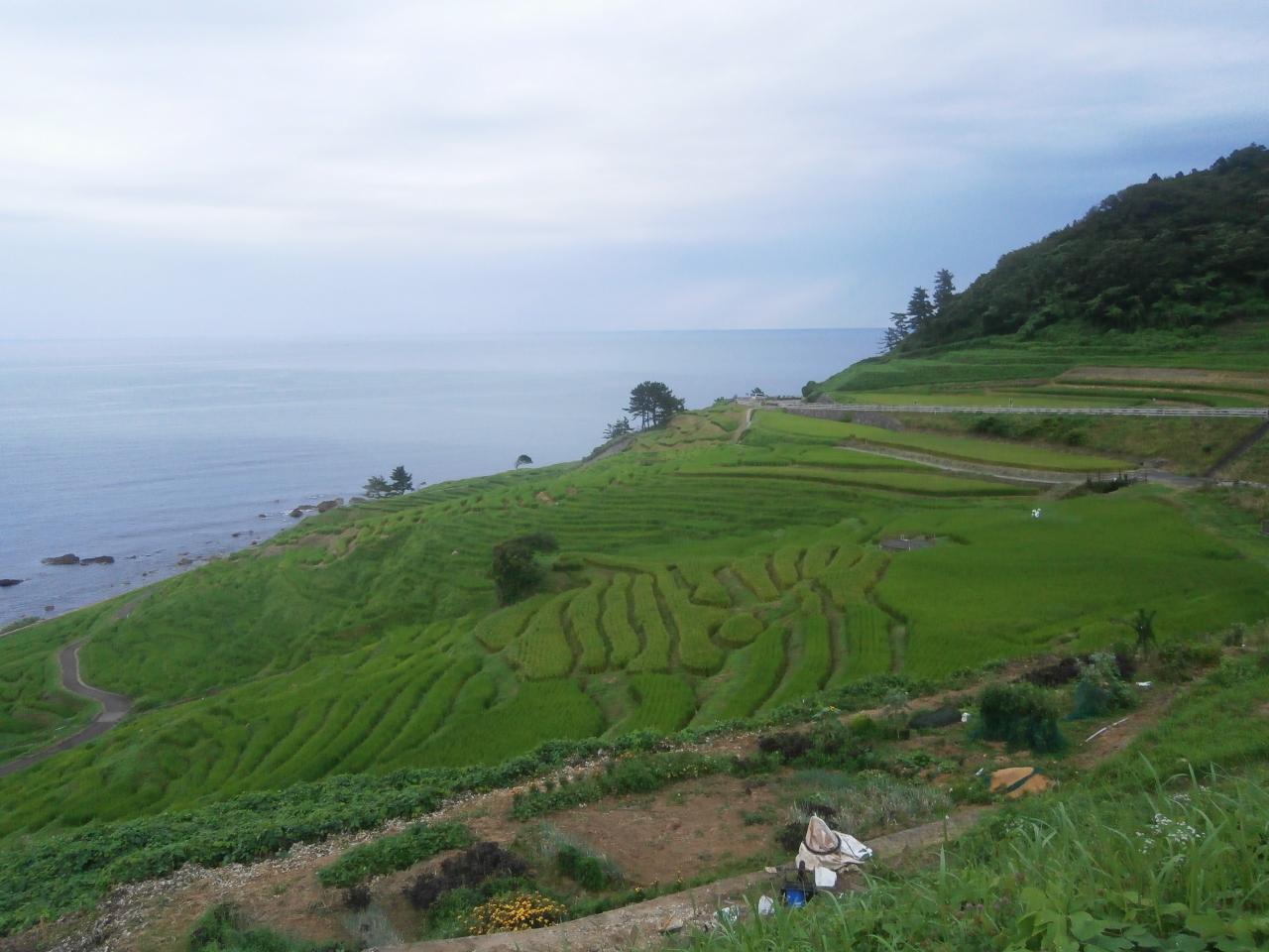 いわゆる棚田になりますが、棚田といえば普通農村のものをイメージしますが、ここは日本海に面するように緑色の棚田がびっしりと広がっており、なかなか独特の景勝地になっています。