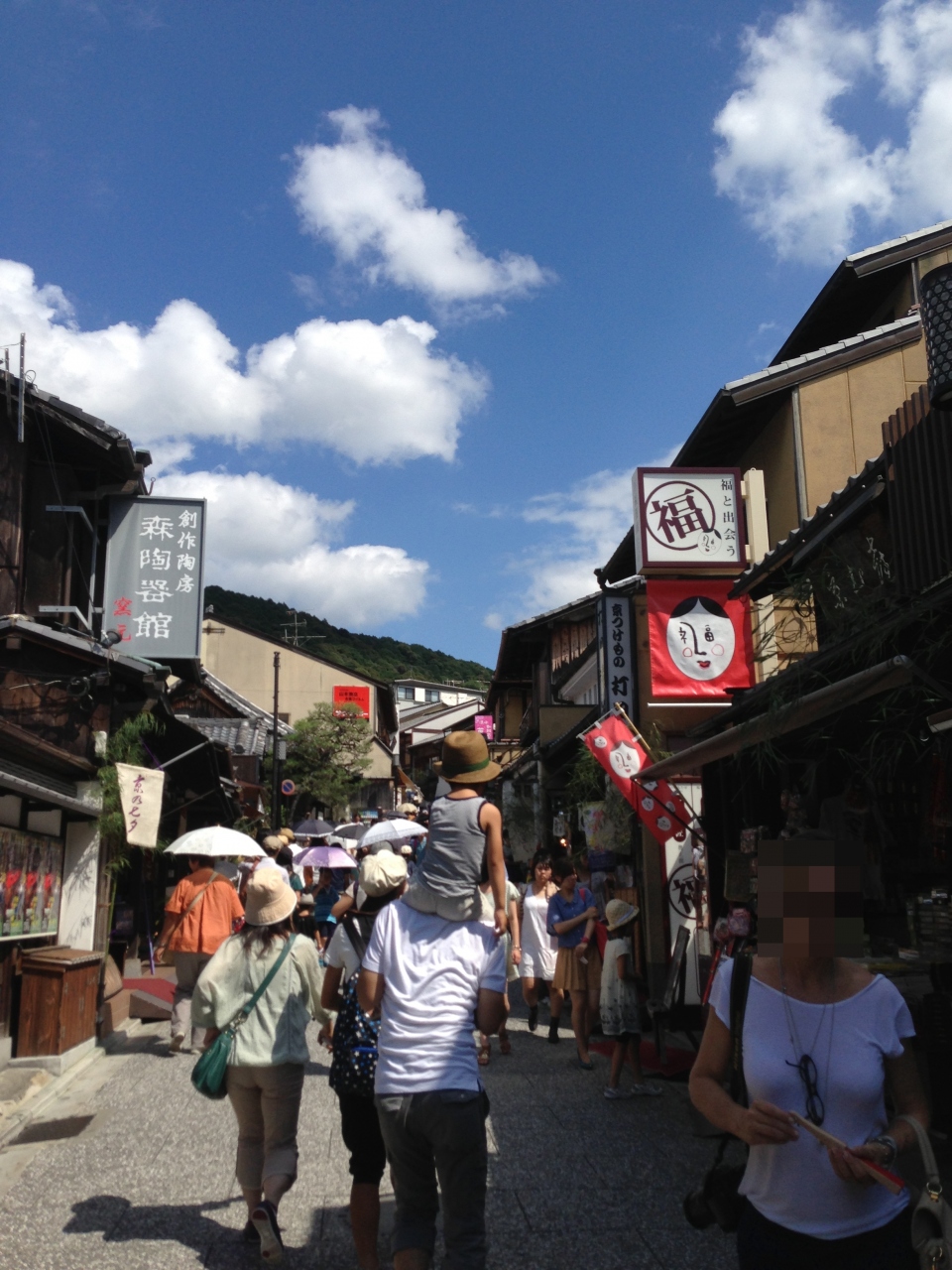 清水寺に続く坂道です。観光客向けのお店が並び、八ツ橋、漬物、小物や雑貨などが売られています。結構、呼び込みもやっていて、お茶の試飲や八橋などのお菓子の試食をさせていただけるお店もあり、それだけでも楽しかったです。この参道は坂道が急で距離も長く、おまけに人も多いので、お年寄りや小さい子供と行く時は注意が必要です。