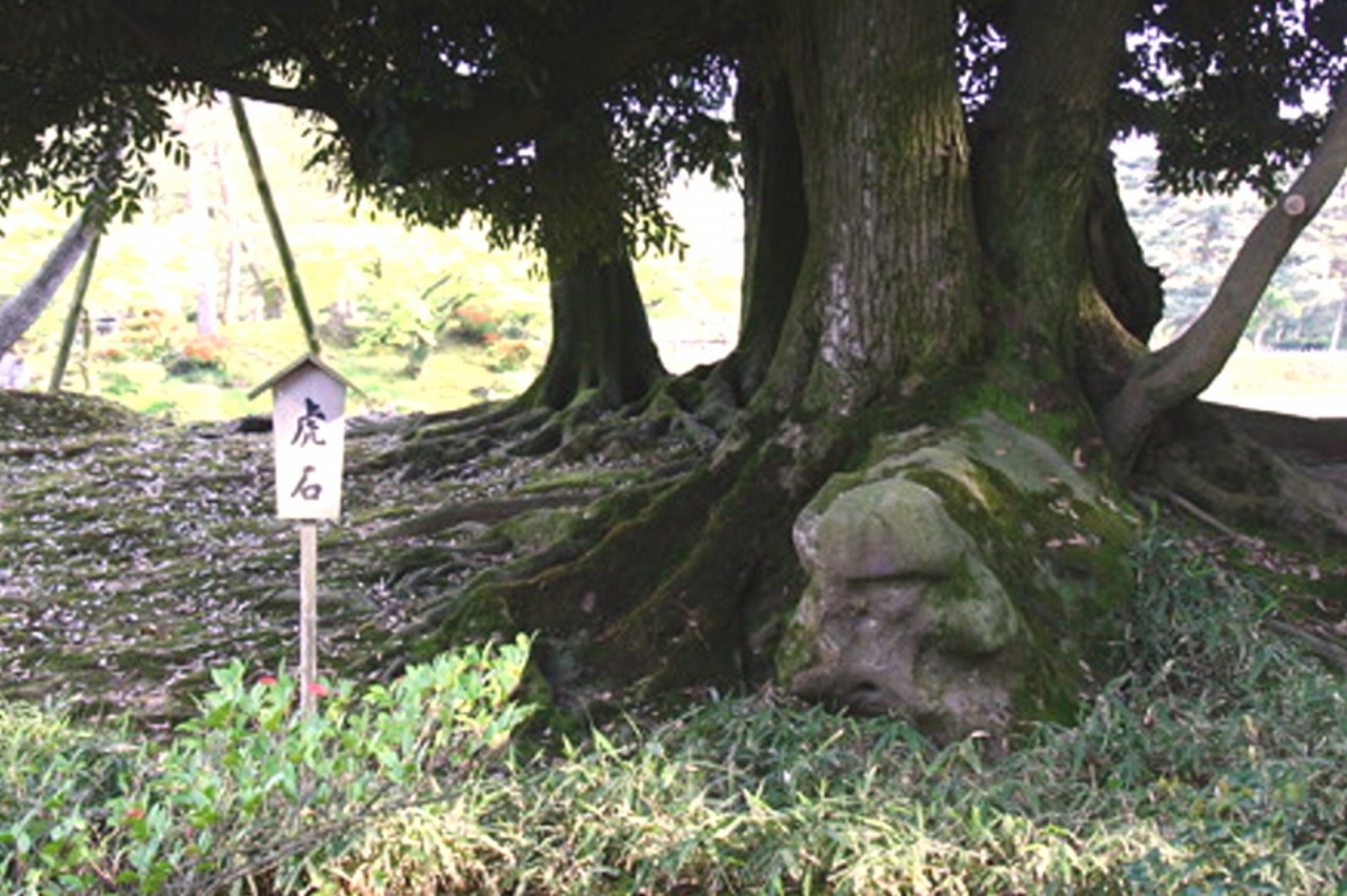 虎石は、 霞ヶ池北岸の徽軫灯籠そばにある、シイノキの木陰の笹薮にあります。虎が前足を 低くして吼えている姿に似ている自然石なんだそうです。能登外浦の曽々木か福浦辺りの産といわれているそうです。獅子巖、龍石とともに兼六園の要石なんだそうです。