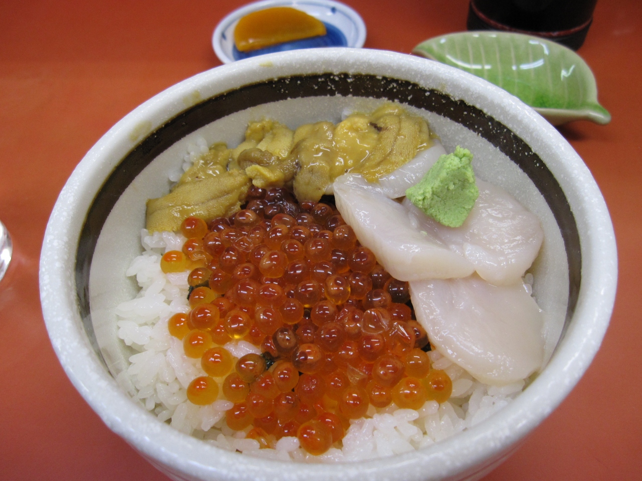 少し待ちました。注文したのは巴丼でホタテ・ウニ・イクラがのっています。