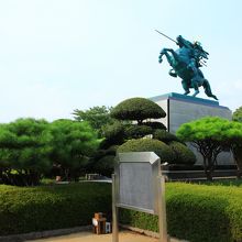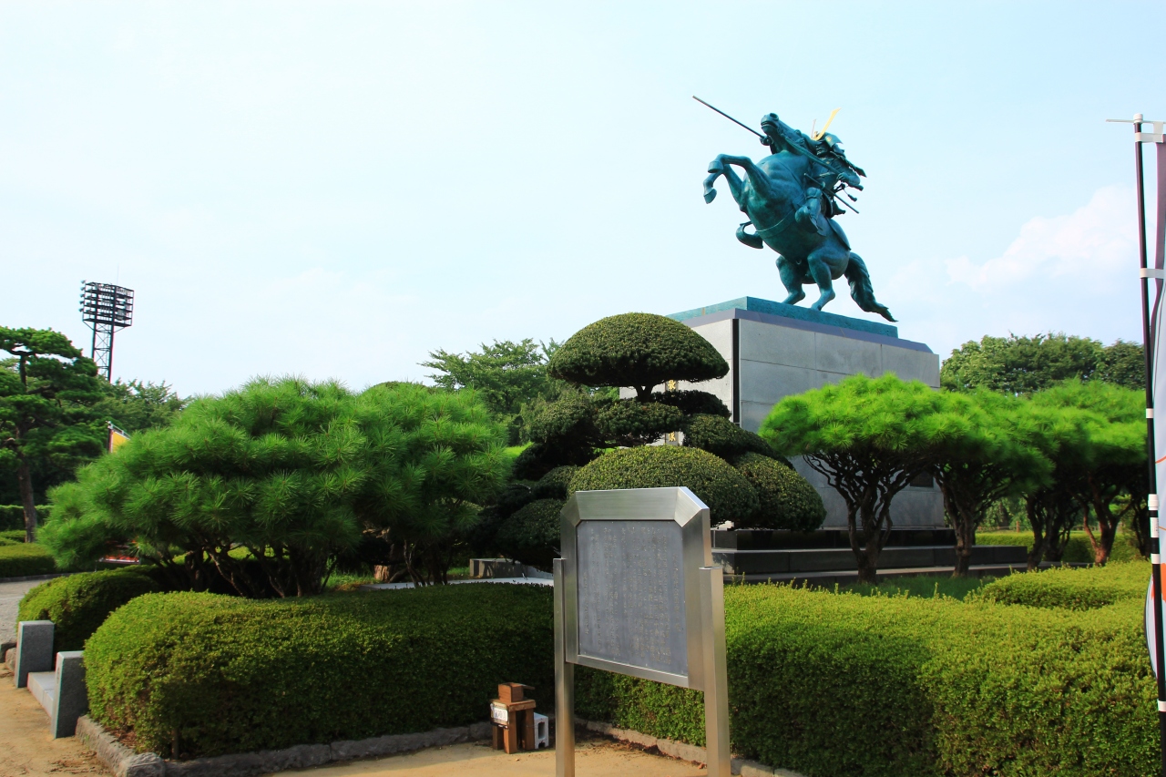 山形城跡に建っている最上義光像です。碑文によると、この像は関ヶ原の役に呼応して上杉領から攻め寄せた直江兼続の迎撃に大名自らが出陣する勇壮な姿を現しているとのことです。
