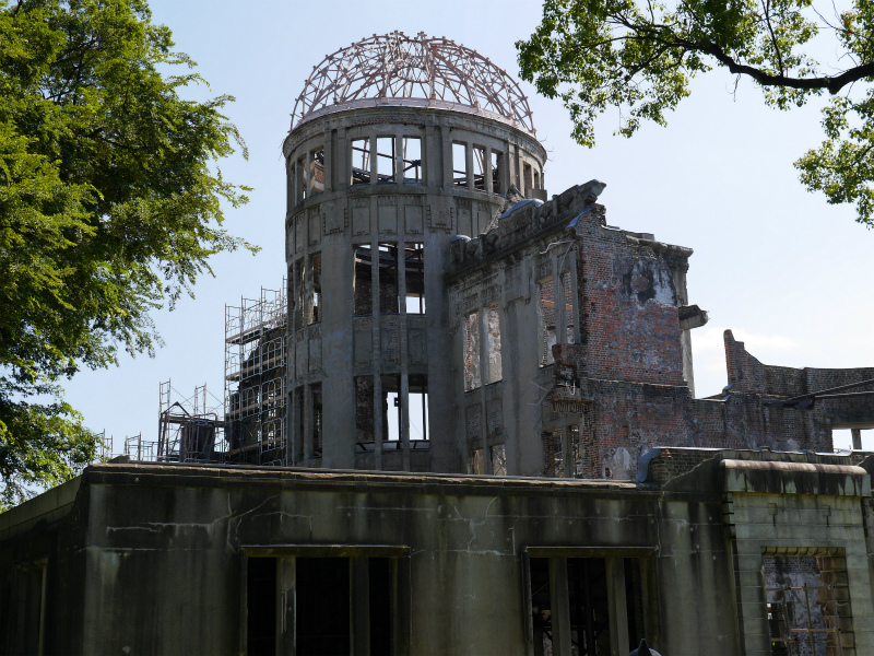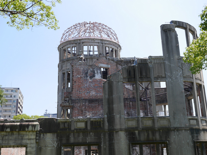 広電原爆ドーム前電停から徒歩4・5分のところにあります。1996年に世界遺産に登録されて今も被爆当時の姿で立ち、一瞬で壊れたこの建物が世界中に人達に原爆の恐ろしさを伝えています。この建物の上空で原爆がさく裂したためほぼ垂直に爆風を受けたため、完全に押しつぶされずに残ったそうです。