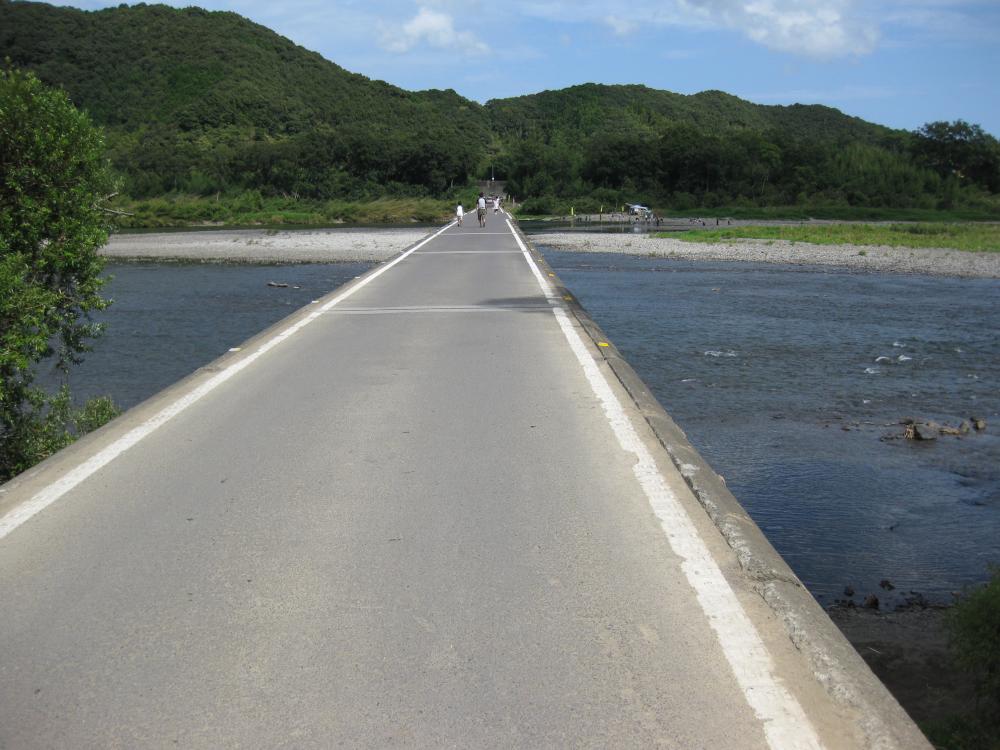 中村の市街地から四万十川沿いに15分程車で走った所にありました。沈下橋と言うのは低い位置に架けられ長さが短く出来る事から安い費用で作る事が出来るメリットを持つ反面で増水時には橋として機能しなくなるという欠点を持っているらしいです。中には流される前提のモノもあるらしいです。山間部や過疎地などの比較的交通量の少ない地域で生活道路として多く作られたらしいですが現在は山間部でも広い道路や本格的な橋が造られる事と慣れているはずの地元住民でも転落事故が絶えない事から徐々に姿を消しつつあるらしいです。