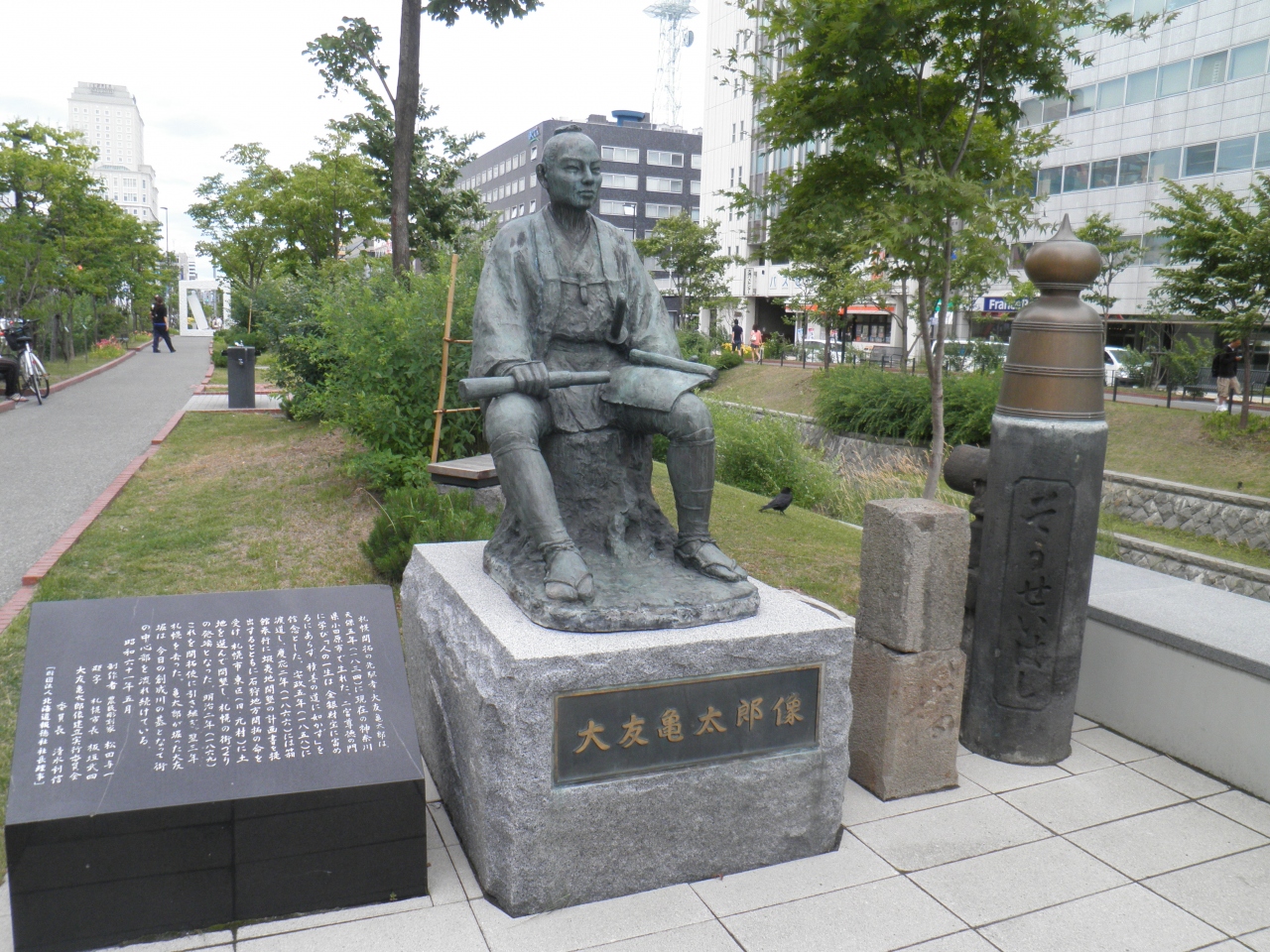 ひさしぶりに札幌の創成川にそってつくられた創成川公園に行きました。 川にそって作られた細長い公園で、地下には中心部をバイパスする創成川トンネルの上になります。 ここに創成川のもとになった大友掘りに貢献した大友亀太郎の坐像があります。ちょっと微笑んだような柔和な像です。 ちょうど、近くでアーケド型商店街の狸小路で狸まつりが行われており、賑やかになっていました。