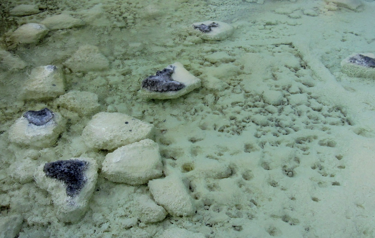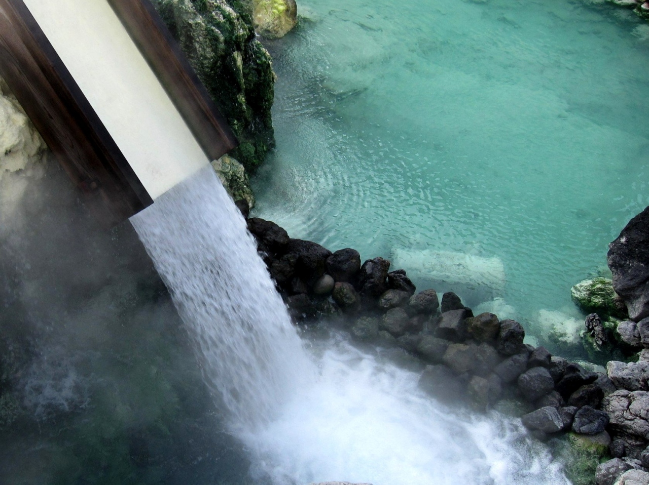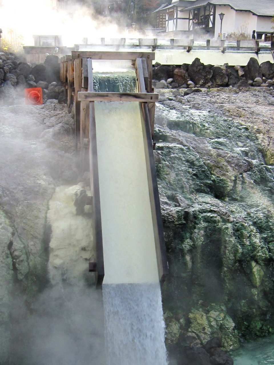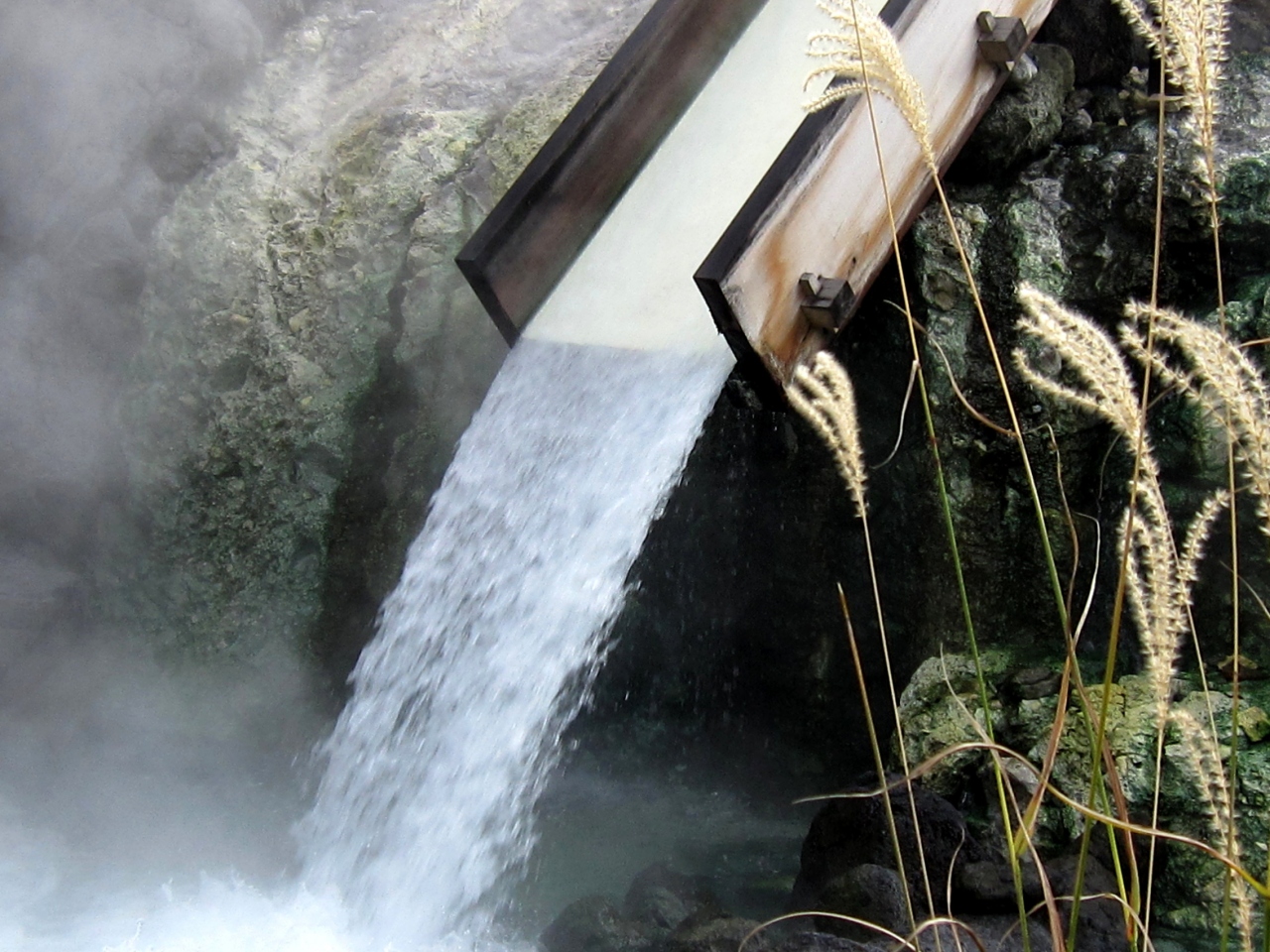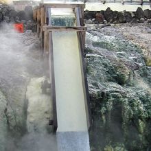 湯温が摂氏50~90度の温泉が見ている者に向かって流れ落ちる感じは
