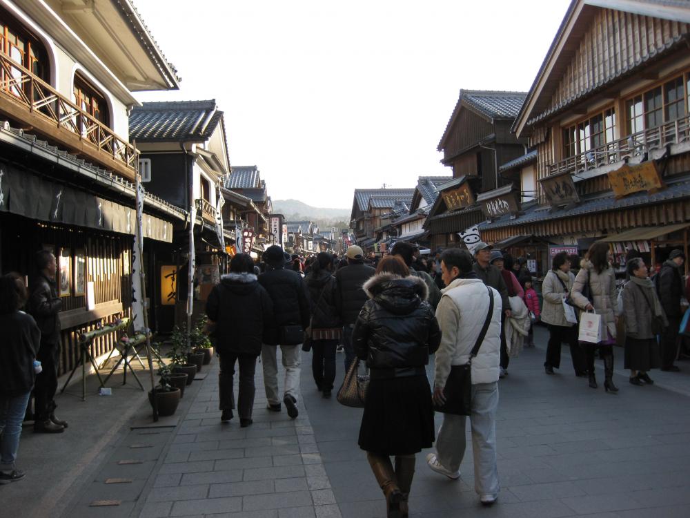 伊勢神宮内宮正宮の近くにあります。伊勢参宮街道に沿って妻入りの木造建築が立ち並んでいます。有名な赤福の本店や伊勢郷土料理の手こね寿司や伊勢エビコロッケや伊勢茶などの店がたち並んでいました。散策すると楽しい所です。