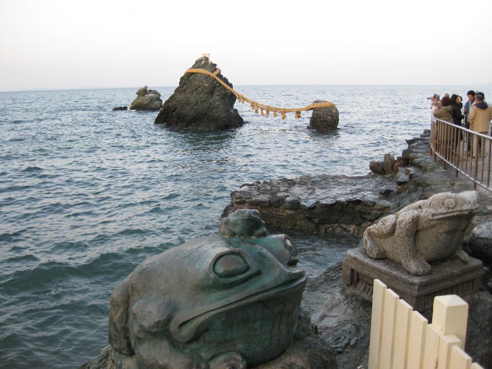 夫婦岩は二見興玉神社にあります。この神社は夫婦岩の沖合約700mの海中に沈む祭神・猿田彦大神縁の興玉神石を拝する神社らしいです。二見浦の夫婦岩を眺めました。カエルが神の使いとされていて蛙の石像が多かったです。