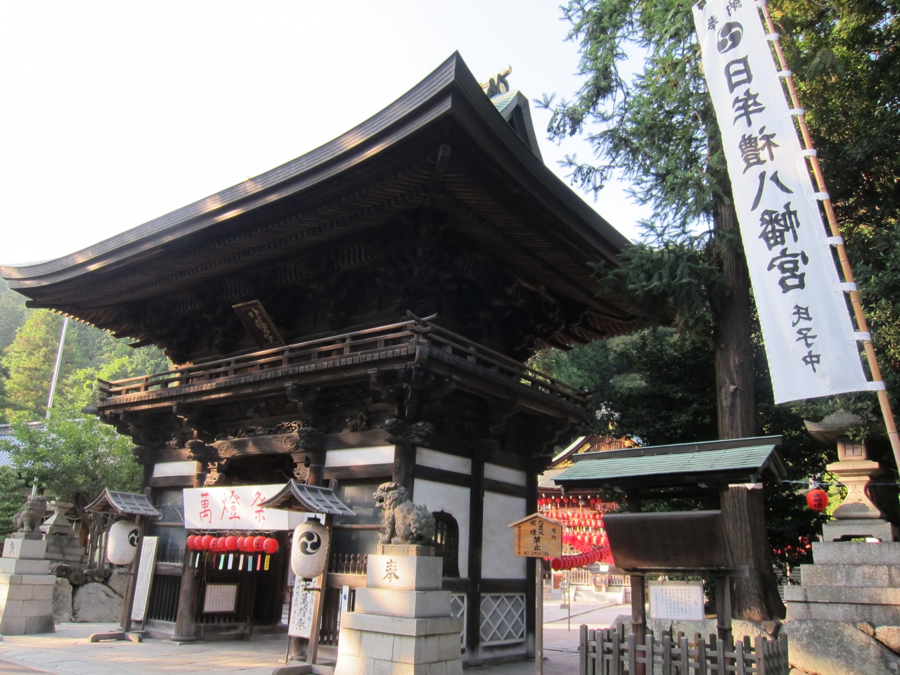近江八幡にある深い緑に囲まれた立派な神社です。鳥居をくぐると右手にたねや、左手にクラブハリエがあり、その奥右手に社があります。訪問した日はちょうど8/15,16に行われる萬燈祭の前日で境内には赤い提燈がぶら下げられ、中華寺院の様でした。