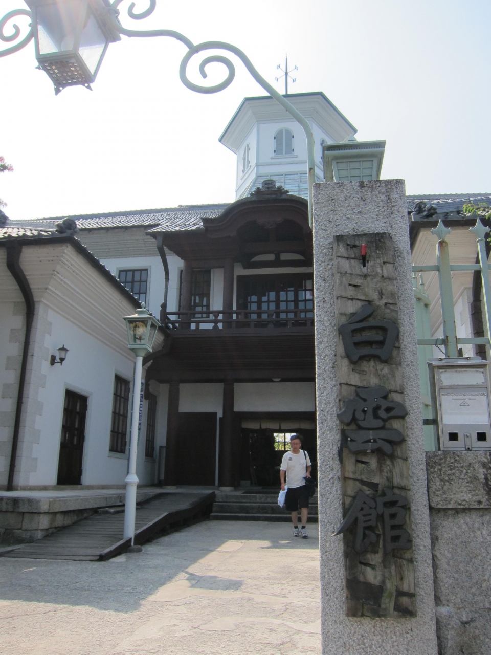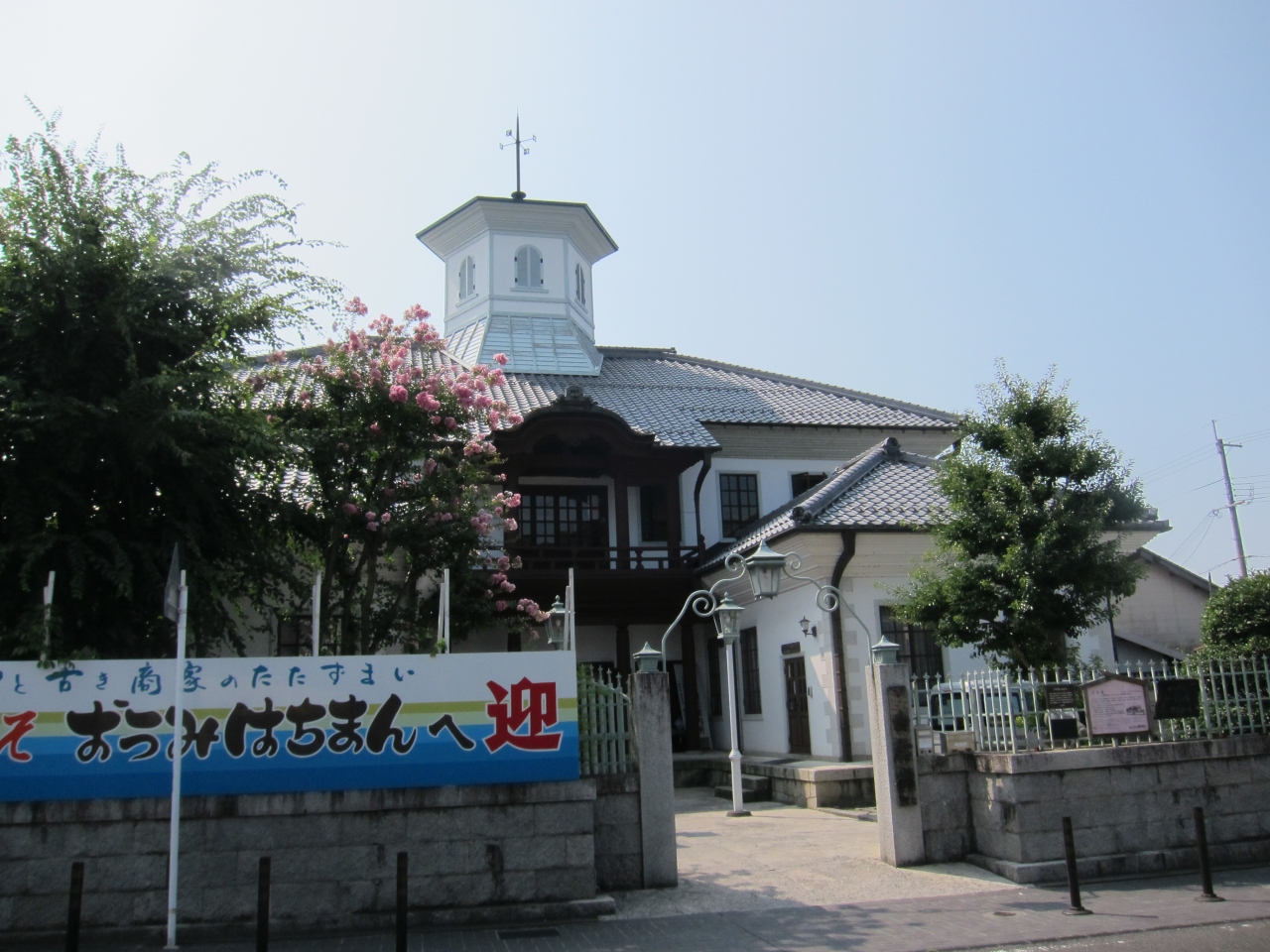 日牟禮八幡宮の白雲橋の鳥居の対面にある白雲館は明治10年に八幡東学校として建築された洋風建築を模して建てられた木造の建物です。現在は1Fは観光案内所と使われ、近江八幡であった時代劇等のロケ当時写真が展示されており、観光パンフレットなどがおかれています。2Fはホールになっており、行った時は何も展示していませんでしたが、鳥居を正面に見ることが出来ます。