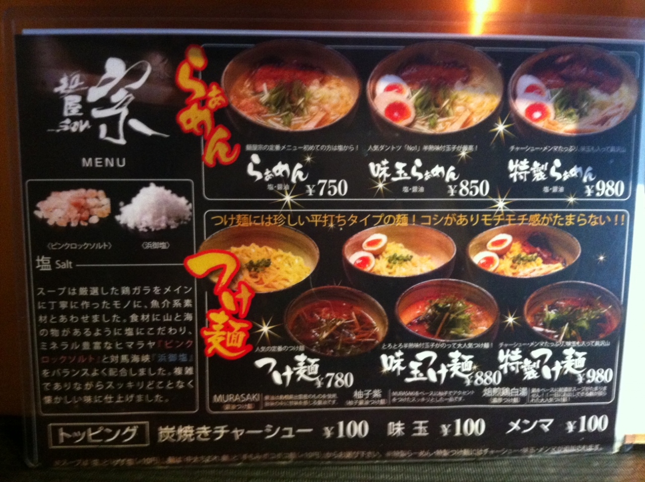店内の広告には、まずは塩ラーメン、次にしょう油ラーメン、その次につけ麺を試してください、とありました。