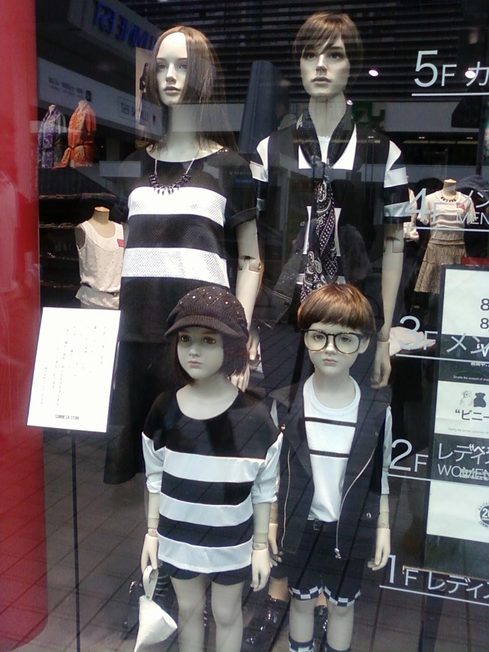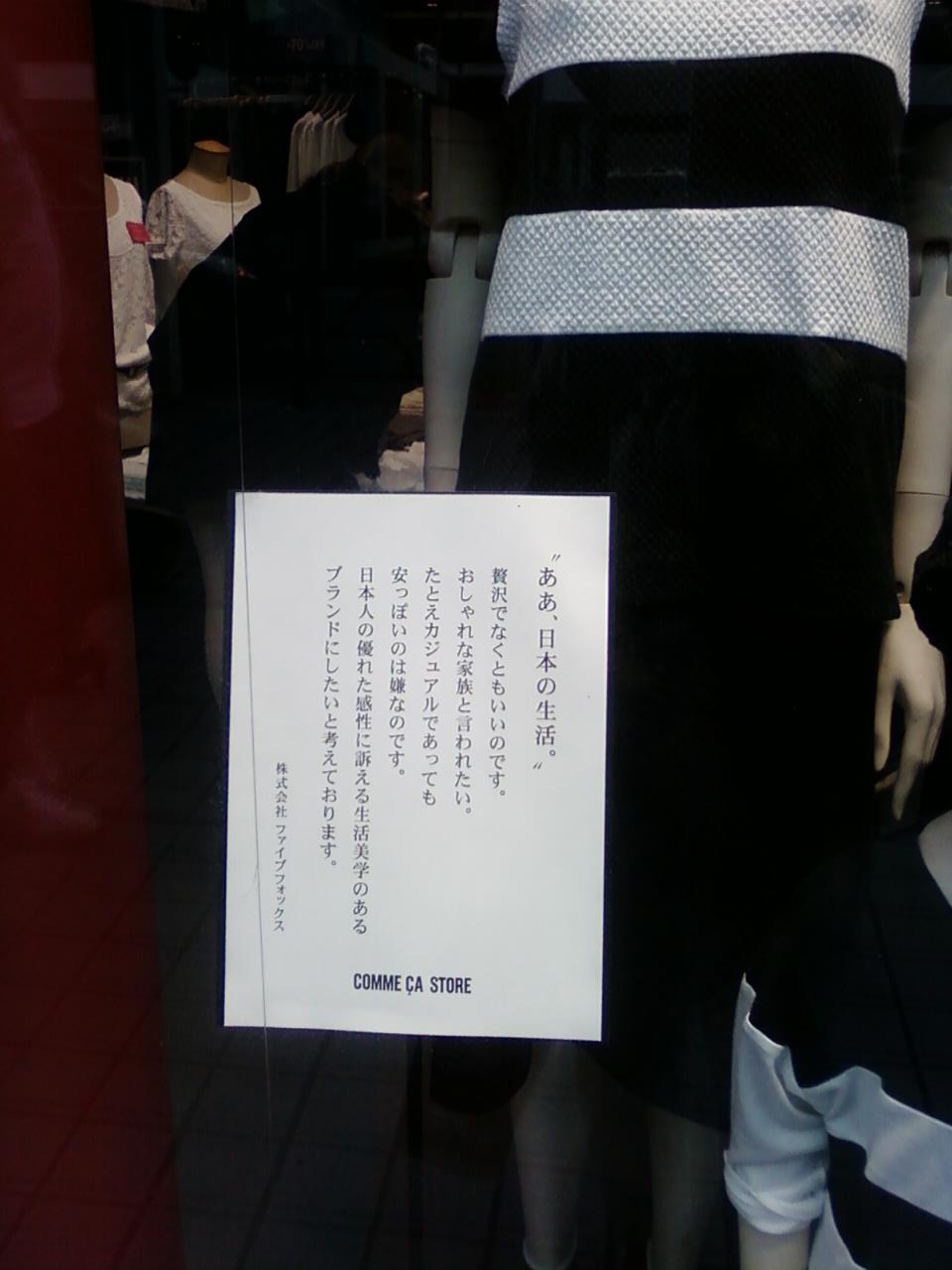 ここのコムサストアは、新宿駅東口から1分くらいのところにあります。このあたりには大手の衣料品メーカーさんの独立店舗がいくつかあるのですが、特にここはコムサらしいコンセプトで、ファミリーでできるシックなおしゃれ、流行に左右されないベーシックなおしゃれを目指しているように思います。店頭に会社からのメッセージが貼ってありました。