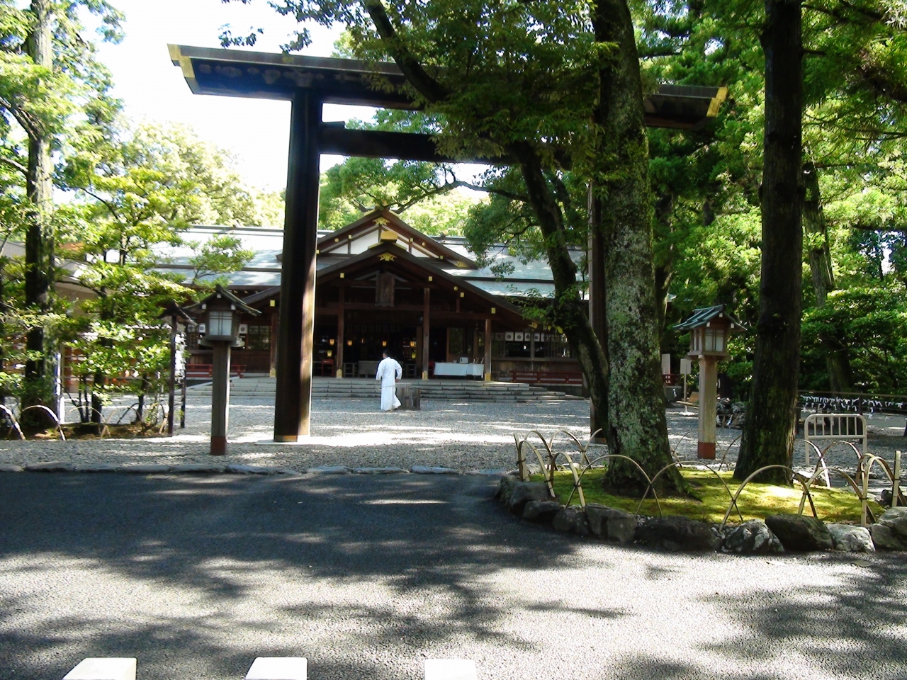三重交通バス猿田彦神社前下車すぐ。御祭神は天孫降臨の際に高千穂に瓊瓊杵尊を御案内した猿田彦大神。「みちひらき」の神として名高く、交通安全・方位除けの神社として信仰されている。本殿は特殊な妻入造である。ここから賜った「清砂」で地鎮祭・家屋敷の祓い清めを行います。