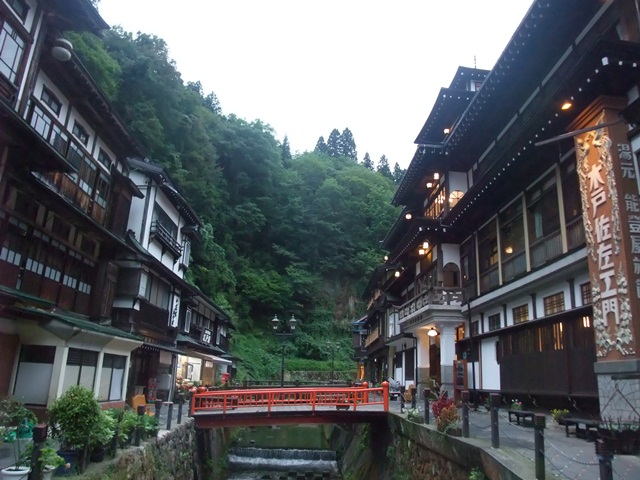 銀山温泉は、レトロな木造建築が建ち並び、異空間に迷い込んだような気分です。足湯はぬるめで、街並みを眺めながら川の音を聞きながら、いつまでも入りたくなりました。ガス灯がともる夜もいいですが、夕方のまだ明るさが残るくらいの風情が良かったです。古い建物を維持するのは大変だろうけど、いつまでもあの町並みが残ればいいなあと思いました。