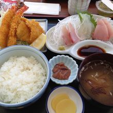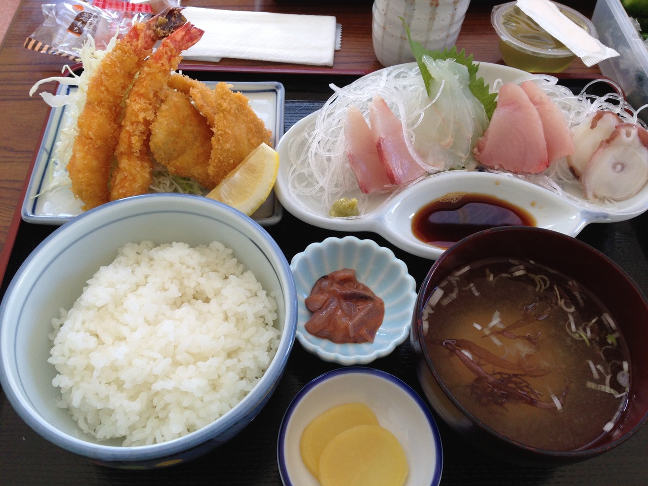 ウニが食べたかったが産卵時期で禁漁とのこと。本当は海鮮丼が食べたかったがが、断念しおまかせ定食1800円をオーダー。エビフライ2本、白身魚のフライ2ケ、お刺身がつく。お得なような、普通なような。海鮮丼を食べた人が