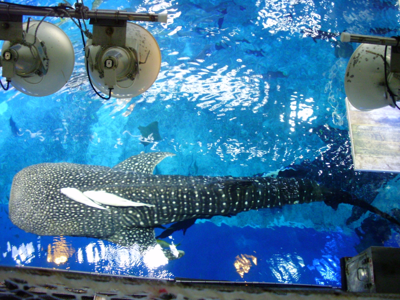 受付所脇のエレベーターで3Fまで上がり、物を落とすことのないようにと注意をうけ、イヤホンのチェック後、ガイドさんがいろいろ説明してくれます。機械の音など雑音が多いので、ガイドの方はマイクを使い、私達はトランシーバーを、イヤホンで聞きます。15人と定員も少ないので、質問にも気軽に答えてくれます。ジンベエは上の方を泳ぐことが多いようで、ここから見ると、肌の色などよりいっそう分かります。約15分間、写真を撮るのに夢中になってあっという間に時間が経ってしまいました。