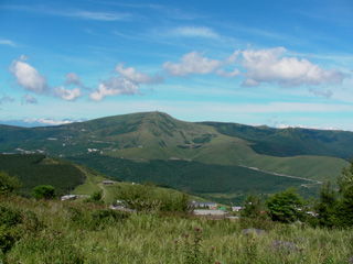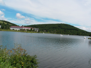 八子ヶ峰の西峰からスキー場のコースを下っていくとまた平らな尾根道になり、階段を下っていくと白樺湖のスキー場の上に出て、暑い日ざしの中をスキーのゲレンデの中を下っていきます。白樺湖の中央の天然の氷を区切ったスケート場があり、蓼科山を望みながら滑り、手すりがないので休憩できないリンクでしたが、温暖化のせいか最近は天然リンクはなくなったようです。