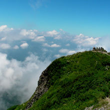 笹平から最後の急な登りで山頂の一角に出ると、祠のある北峰と最高地点の南峰がある双耳峰で、谷川岳のオキの耳とトマの耳に似ています。途中でバテて一時は2000mに満たない山で退却かと思いましたが、バス停から4時間弱でなんとかお昼前に山頂に着いてみると、白馬岳から朝日岳に続く尾根の一部が雲間から覗いています。