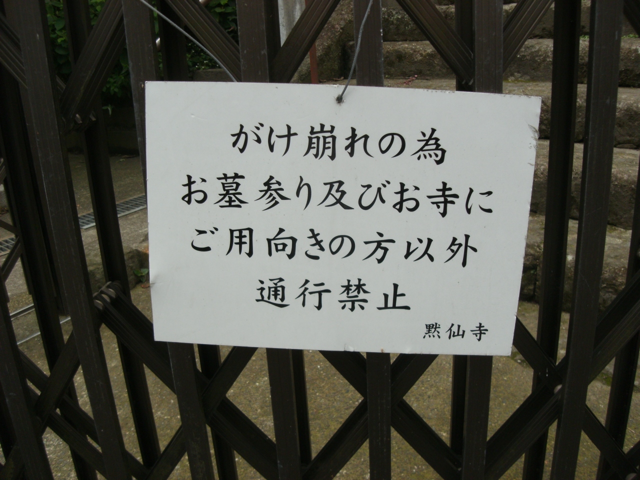 無我相山・黙仙寺、曹洞宗です。明治以降のお寺です。山の中にあるお寺ですので本堂まで石段の長い参道、ここらあたりは急斜面崖地ですので危険の貼紙も・・足元は非常に悪い。人影のないとても静かなお寺です。