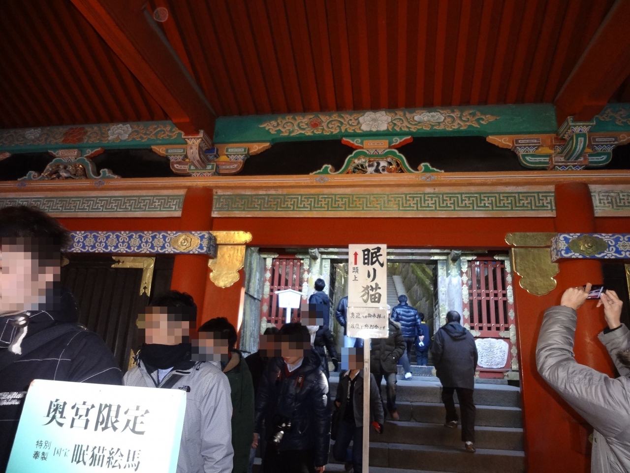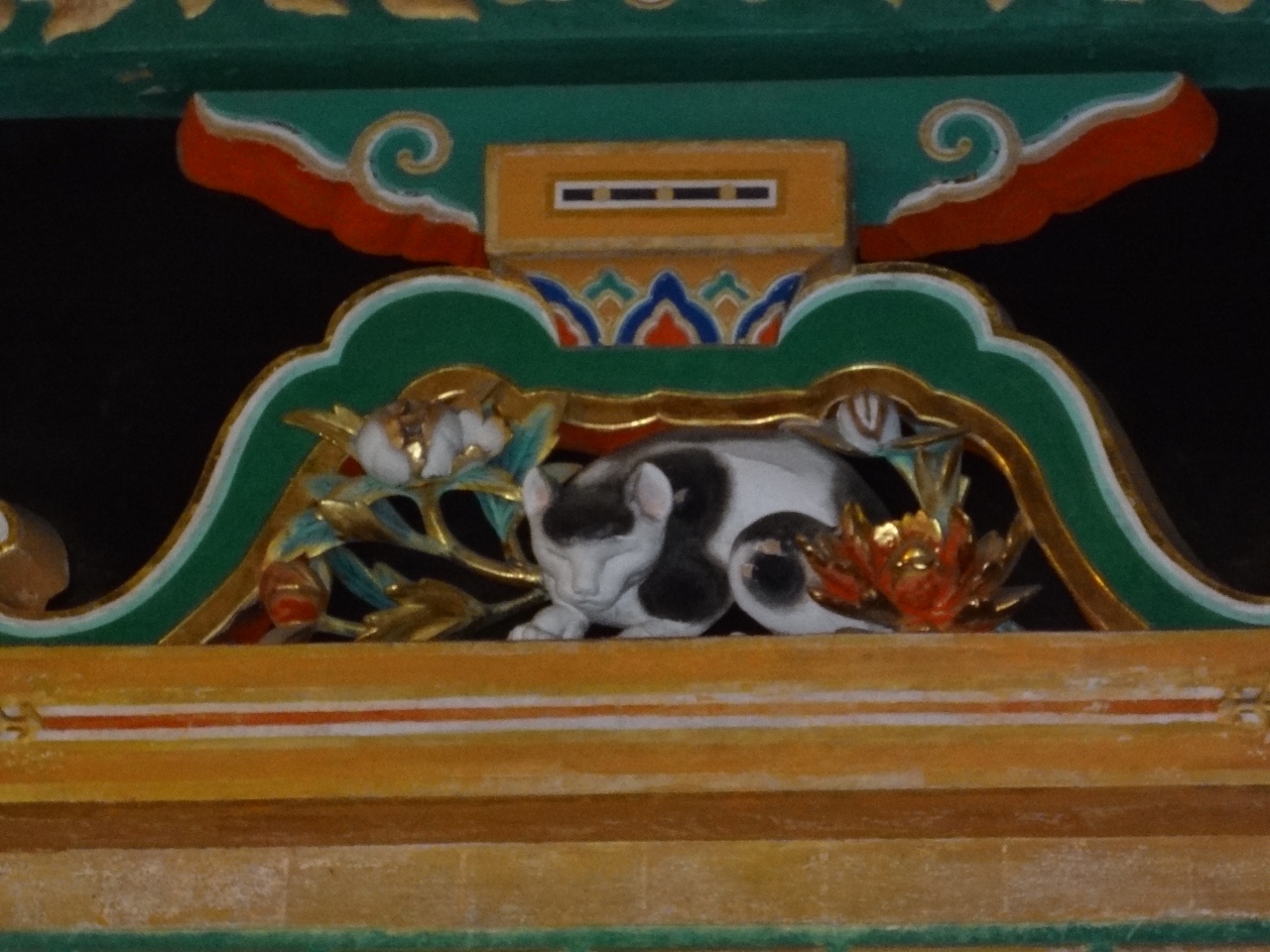 日光東照宮に行ったら眠り猫を見なくては..と、猫好きの我々は東回廊・奥社拝観券を購入して中へ入りました。「眠り猫」と上向き矢印が書かれた看板を見つけましたが、小さく書かれた「頭上」の文字が目に入らず、「先に見える階段を登るんだ..」と勘違い。頭上の眠り猫を素通り、奥の院に向かって階段を登り始めてしまいました。幸い登りだして間もなく間違いに気付き、眠り猫に対面できましたが、その小ささに驚きました。ガイドブック等の写真のみで大きさを知らなかったことが原因ですが、誤った先入観とは恐ろしいものです..