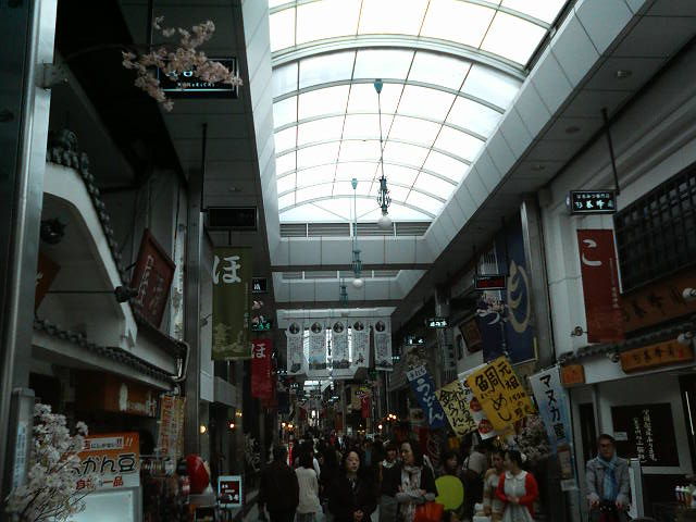 有名な鯛めしをはじめ、様々な飲食店や民芸品、土産品を売る店が並び、温泉へ行く観光客もほとんどがここを通るのでかなり賑わっています。