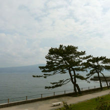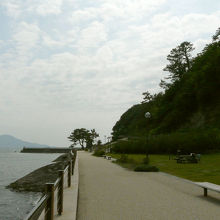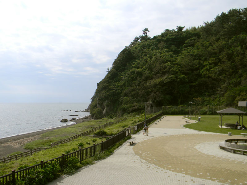 入口から南西の突端まで、山側に芝生広場が設けられ、東屋やベンチがあります。海側にはテラスや奇岩のある展望台があり、駿河湾を挟んで、伊豆半島や日本平を眺めることができます。