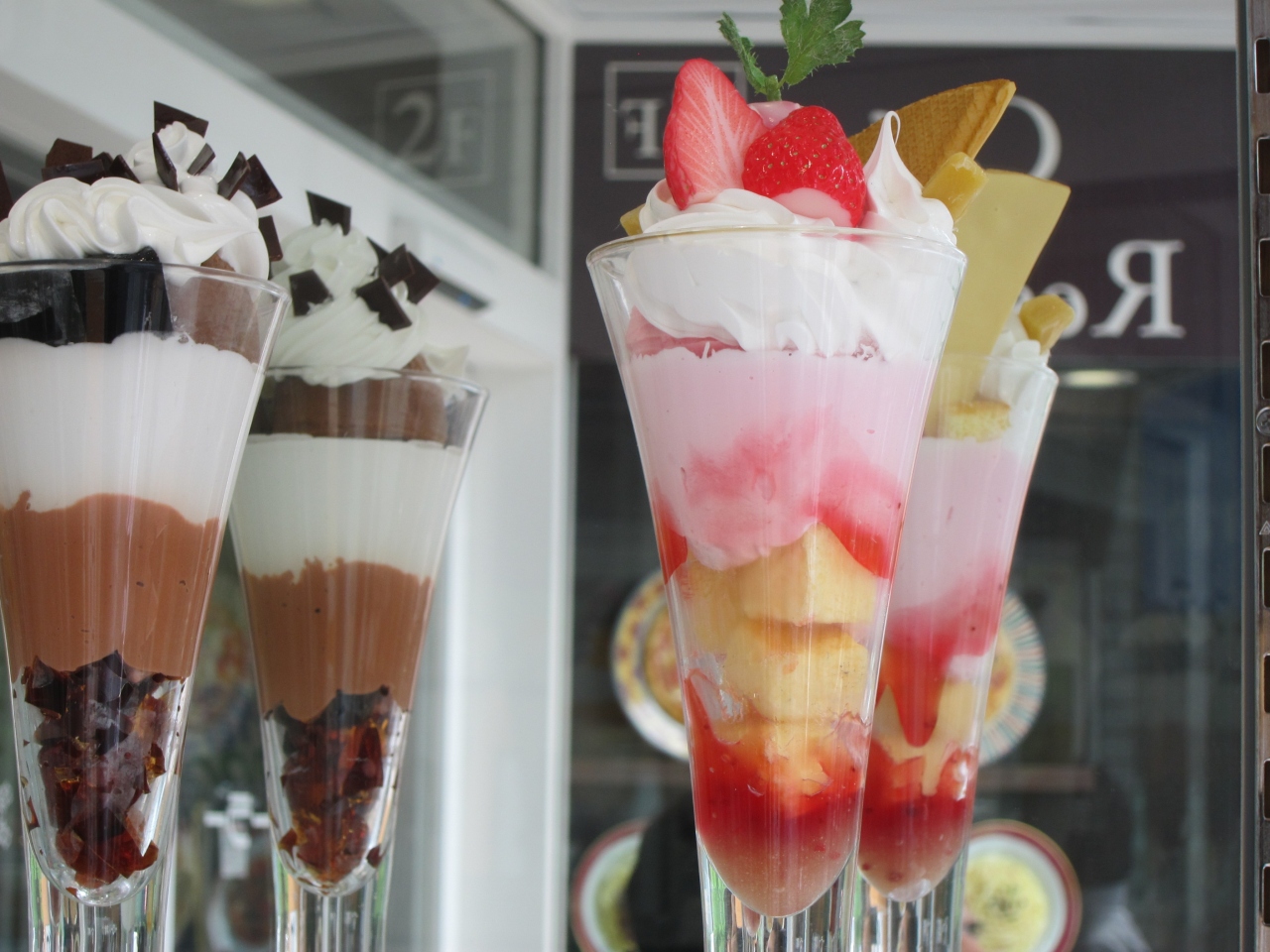 男子のみの集団、ジャンボパフェではしゃぐ集団など皆ここでは大胆!