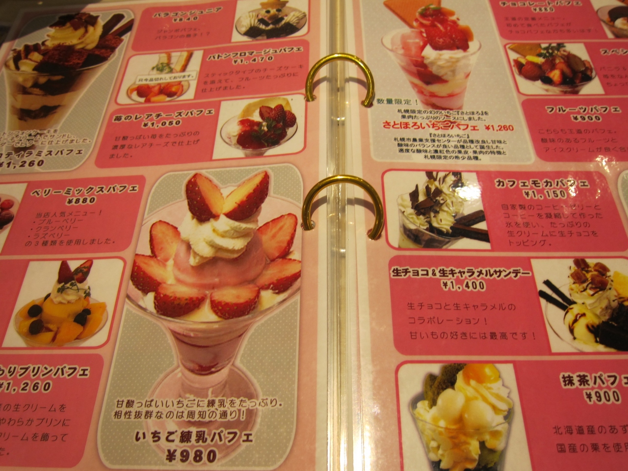北海道(札幌)に来たら一度は寄ってみたいスイーツの店です。パフェ満載。大小相当種類があり、選ぶのにも相当迷います。メニューには他にもチーズカレーやパスタ、ピッツァ、ハンバーグ、オムライスなど食事メニューもありました。チーズカレーが気になりましたが、パフェと一緒はどうかなと思い、別の機会にしました。とにかく一回ではメニューを食べきれず、満足しません。何回か通いたい店です。