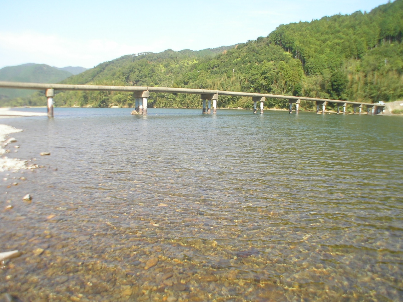 高瀬沈下橋は、四万十川本流に架かる、下流から3番目の橋です。四万十川で3番目に長い沈下橋で全長が232.3mで、橋の中ほどに車がすれ違うスペースがあります。このあたりまで来ると、沈下橋の上流下流ともに川の流れは穏やかになっており、屋形船の運航もあります。近くには、キャンプ場もがあります。