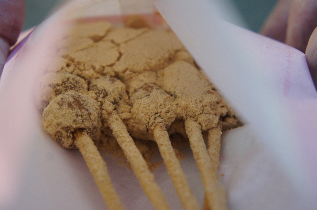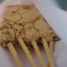 串に刺したおだんごは吉備子屋に比べてもとても小さいので、一口で食べる感じ。たっぷり掛かった黄な粉ですが、最後は袋の底にたまったのも口に流し込んで完了です。