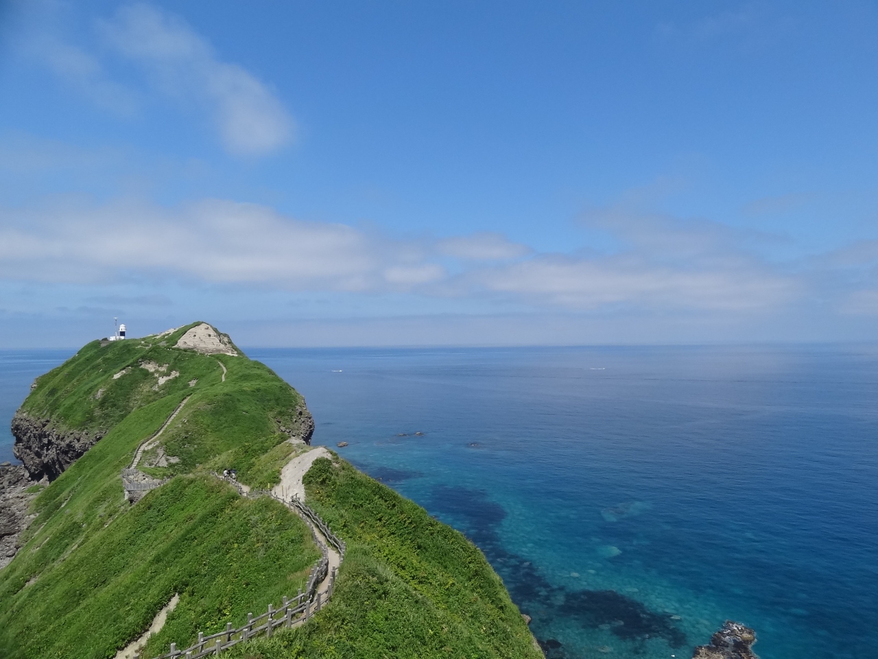 女人禁制の門の向かって左側に広い展望台があるので、体力に自信のない人はここから景色を楽しみましょう。この展望台の逆側、丘に添うような坂道を登った終点も展望台。ここからは海の中に飛び出す神威岬が綺麗にみえます。