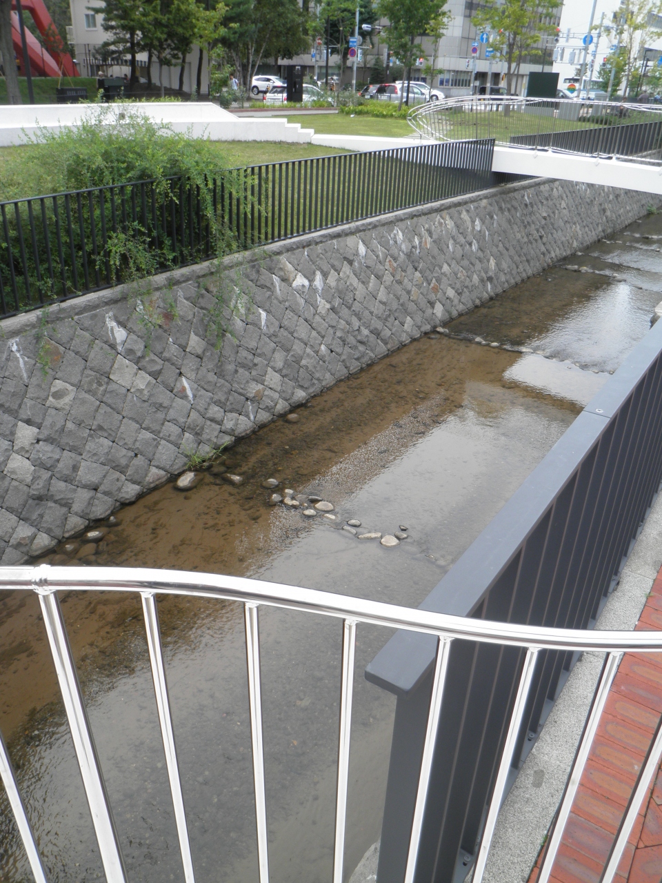 札幌の創成川公園は、大通公園ほど有名ではありませんが、アンダーパスを作るときできた細長い公園です。 真ん中に創成川という小川が流れていて、川の近くまで降りられる箇所があります。 また、おもしろい形の芸術作品が配置されています。 その中でスノーリングは、創成川に架かった白いリング状の橋で、一回りして周囲の景色を楽しむことができます。