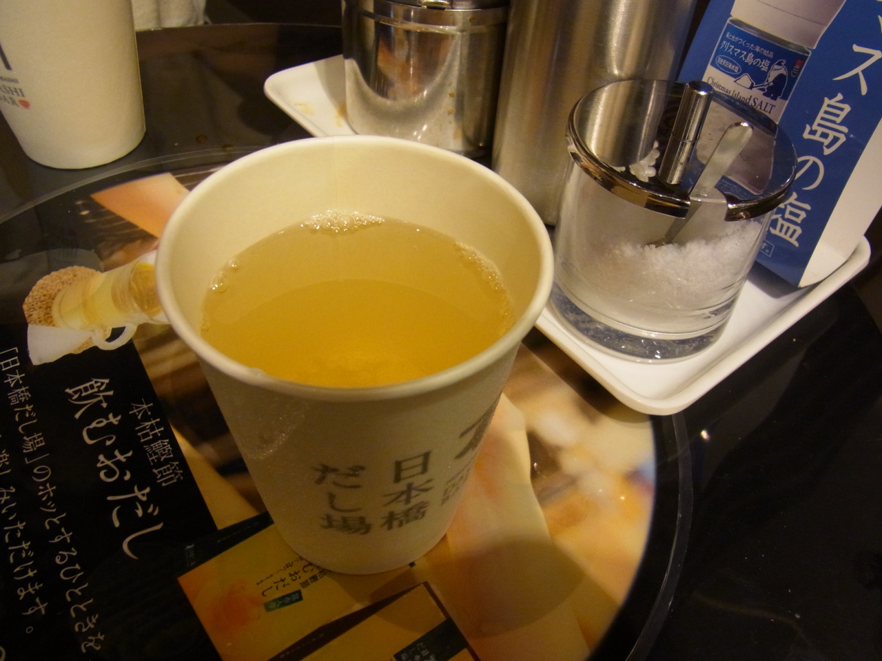 店舗内には出汁関係の商品が多いですが、そのテナントの一角に、だし汁での味噌汁が1杯100円で頂ける場所があります。