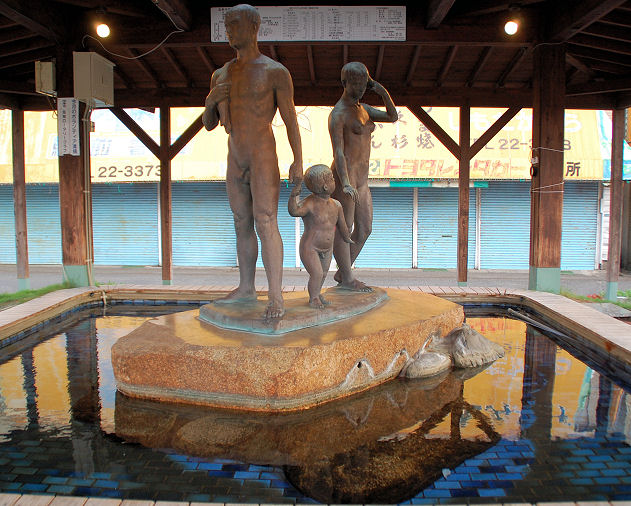 あずまや風の建物の下に湯が豊富に張られており、浴槽中央には温泉に入る家族の姿を表現した像。