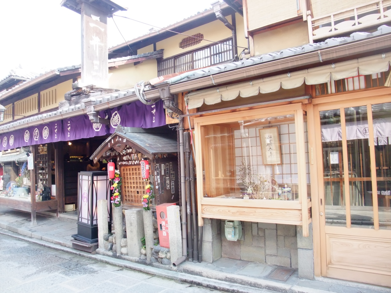 二寧坂にある香りの専門店「二井三」の店先には、延命地蔵大菩薩が祀られており、その延命地蔵大菩薩の祠には、いっぱい千社札が貼られていました。これも、とても日本らしい風景に思えました。