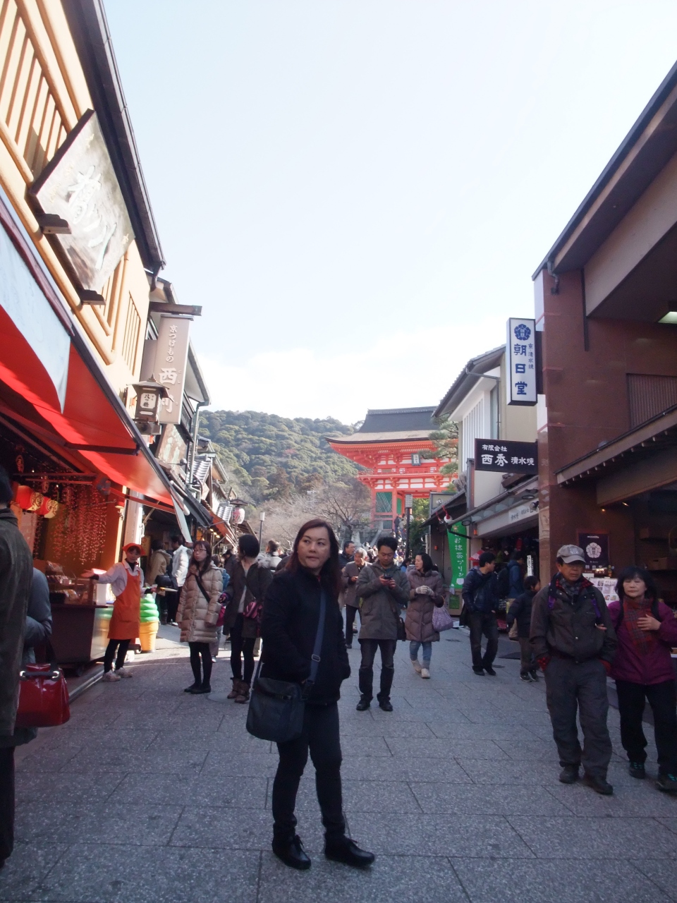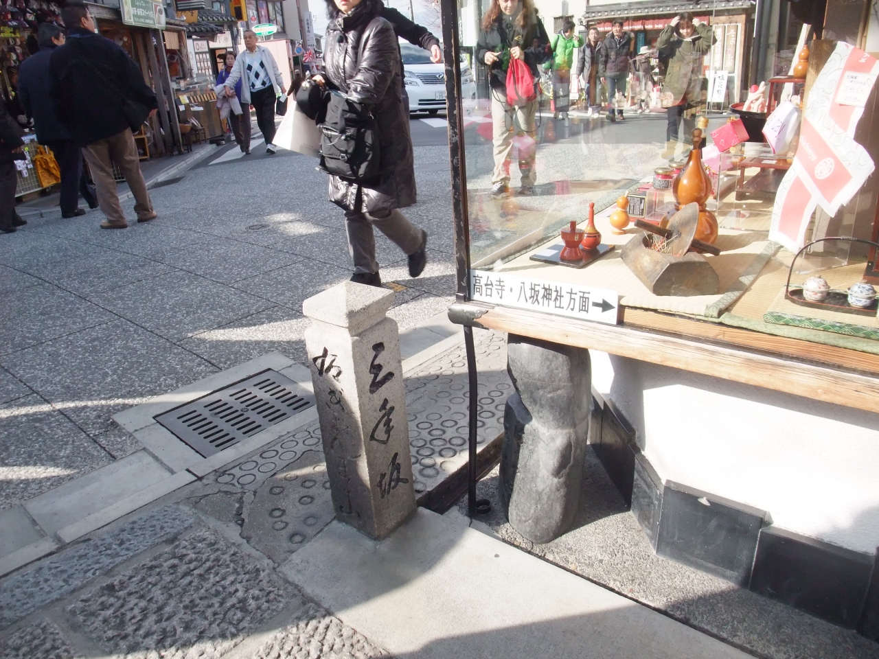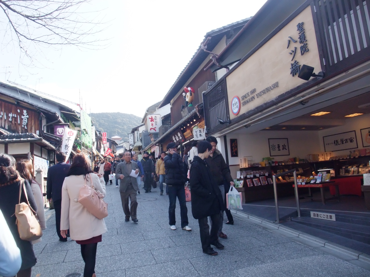 清水坂界隈は、清水寺の門前町で、お土産を売る店や、清水焼を売る店、数珠、扇子、扇、あぶら取り紙など日本的な物を売る店、豆乳ドーナツを売る店や、湯豆腐の店などが軒を連ねています。 ここには有名な聖護院八つ橋の店もあります。