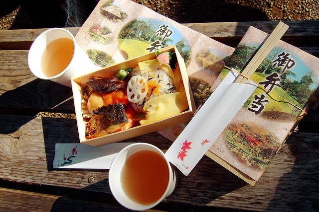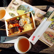 売店をのぞいてみたら、御弁当をみつけ、売店の方に聞いてみると、 ”(小石川後楽園内入口近く、売店前の)「涵徳亭」さんの御弁当だから美味しいよ” とのこと。 結局、この御弁当を購入し、園内で紅葉を見ながら頂きました。