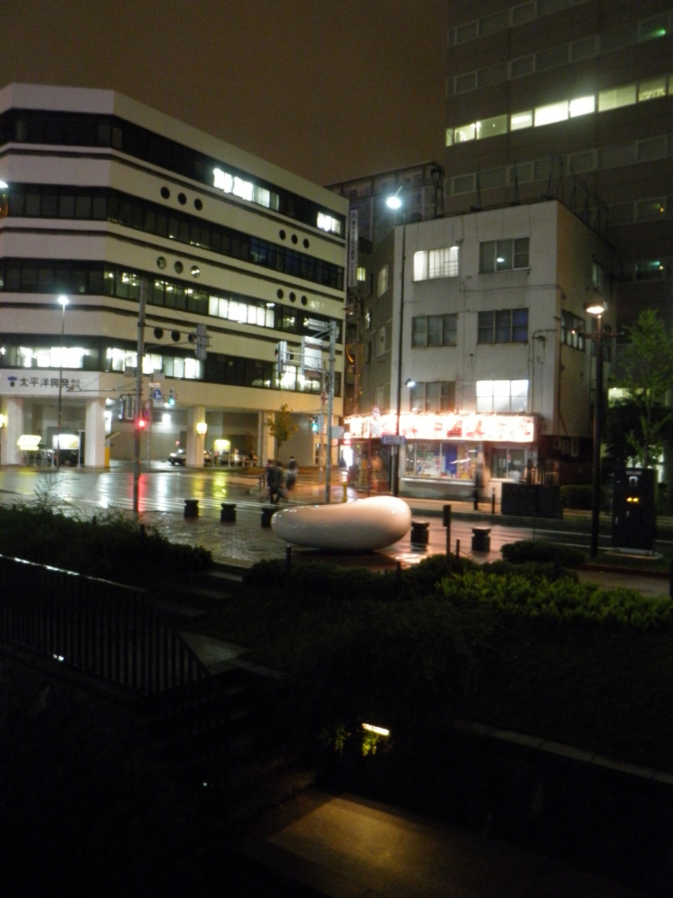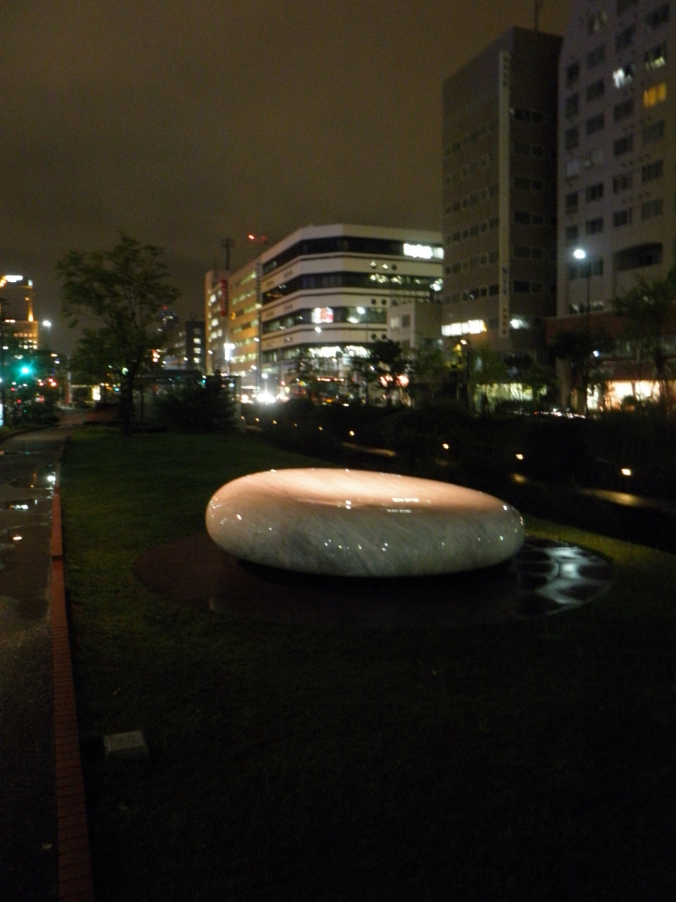 雨があがった後に、夕方、札幌の創成川公園を散策しました。 この川は創成川の両岸に作られた細長い公園で、あちらこちらに芸術作品が飾られています。 野外彫刻の天秘は真ん中のへこんだ白い大きな石で、創成川をはさんで2個おかれています。 夕方はライトが当てられていて、雨にぬれた感じはツルツルピカピカでいい感じです。