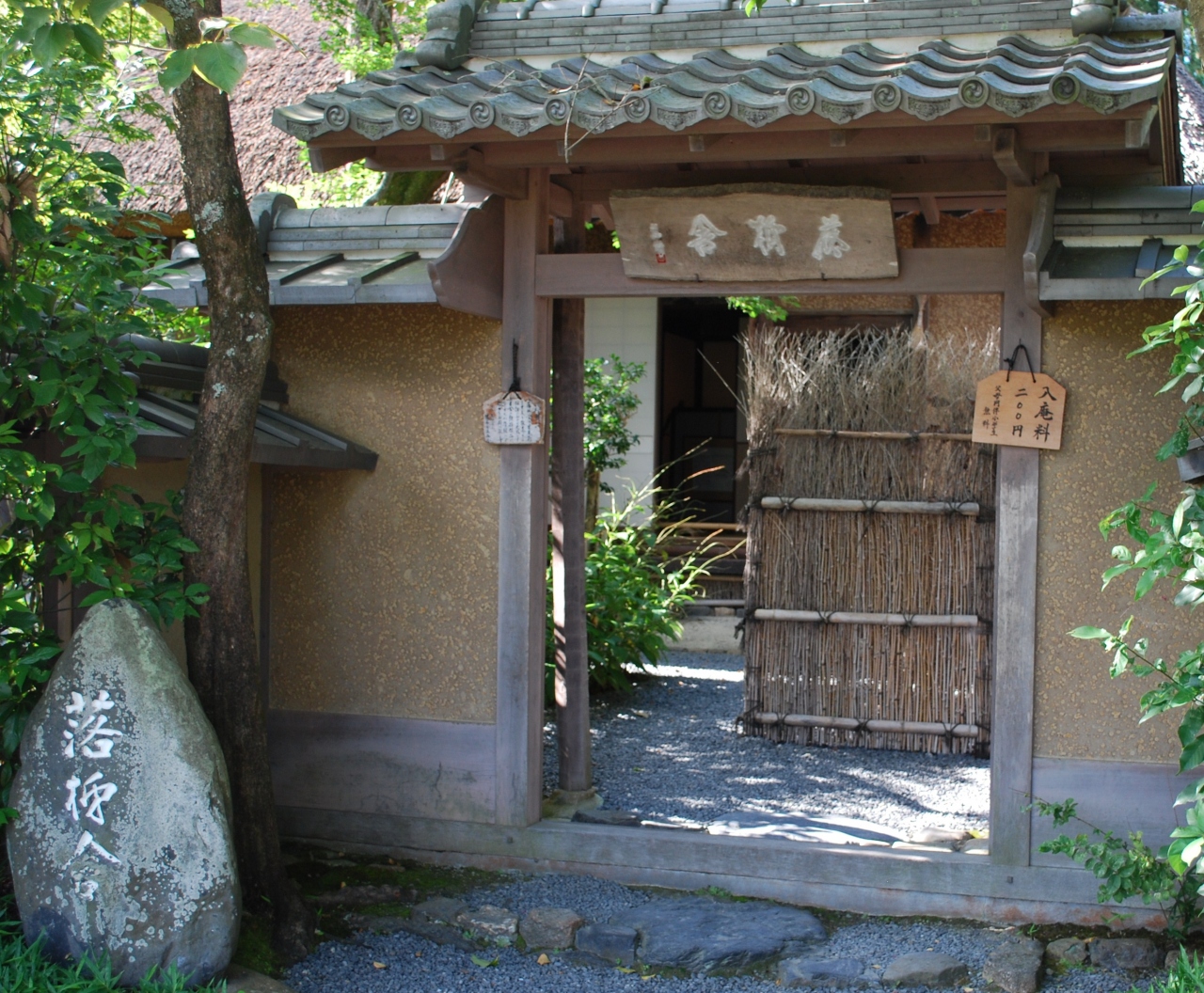 落柿舎とは、芭蕉の弟子、向井去来の別荘の草庵のことである。嵯峨野の中ほど、竹林を抜けて奥の方に進んでくると、ちょっと視界が開け畑の向こうに見えるカヤぶきの屋根の建物が、落柿舎である。建物の中にも入場料200円で入ることが出来るが、俳句好きの人ならともかく門から中を覗く程度で十分であろう。嵯峨野は、見学というよりもあくまで場所の雰囲気を楽しむ、味わう場所であると、個人的には思う。