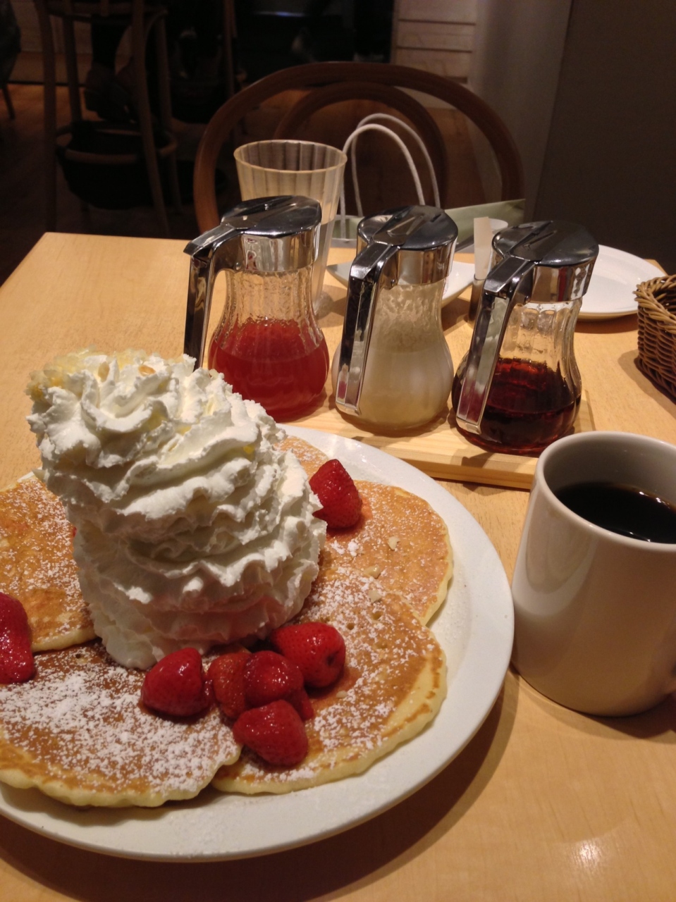 お目当てはストロベリーホイップパンケーキ。初めのうちは温かいパンケーキとホイップクリームがベストマッチで、クリーム上のマカダミアナッツの食感が良くモリモリと食べ進められましたが、半分過ぎから満腹との戦いになり完食できませんでした。