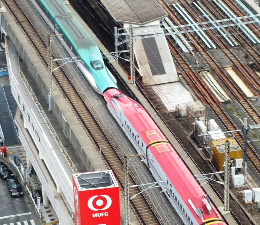 「はやぶさ」型新幹線。正式にはE5系新幹線。現在、最高速度は時速320km(宇都宮-盛岡間)で、世界でもNO1に並ぶスピードを誇る列車である。料金は高いが、グランクラスは人気があり、週末は切符がとりずらい。