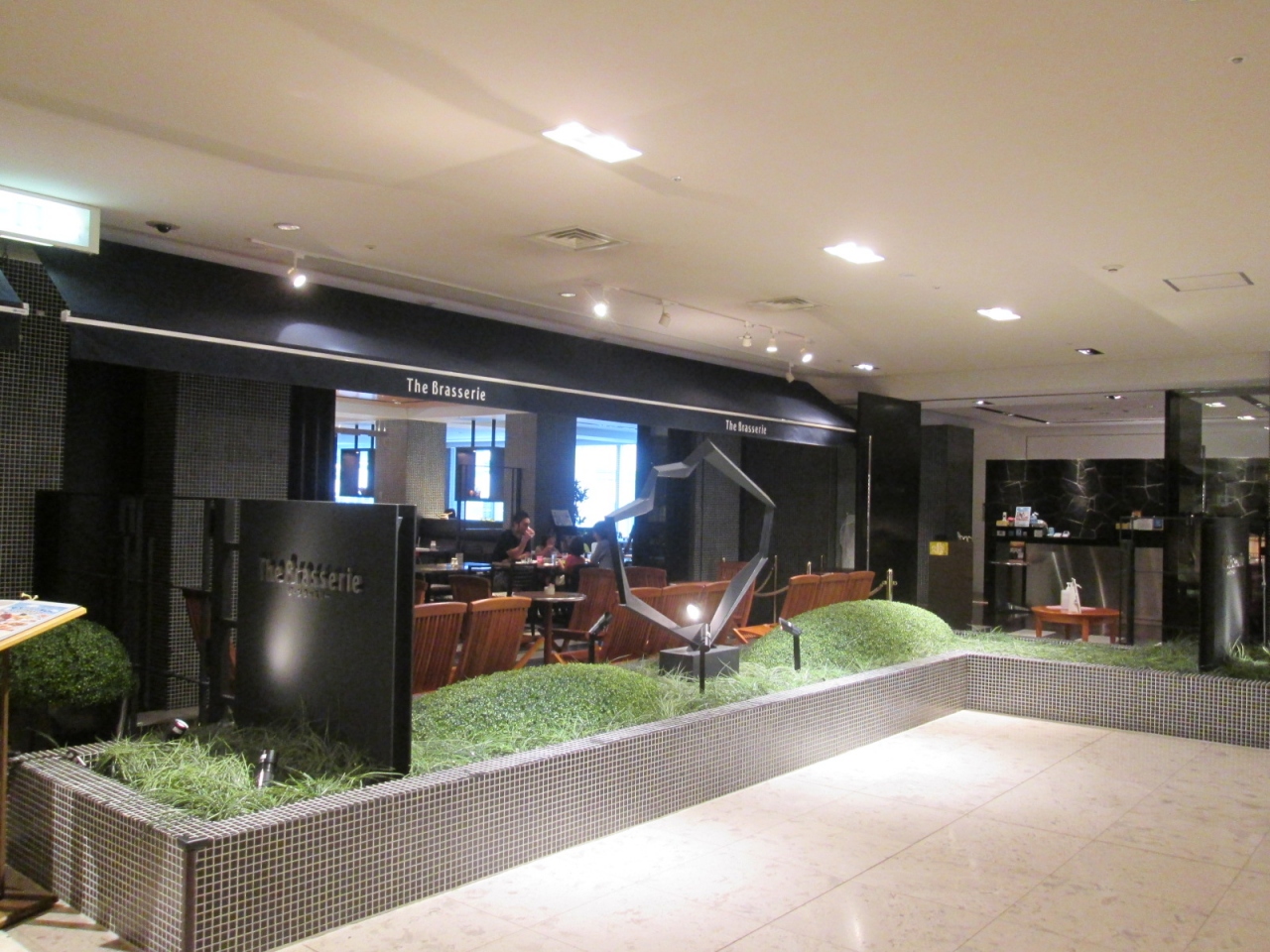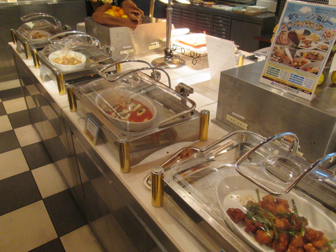 関西空港に到着、昼食に利用しました。国内線到着ロビーから連絡通路をまっすぐ歩くとエアロプラザ、右手にある日航ホテルの入り口を入ると正面にあるのが「ブザ・ラッスリー」です。入口辺りは、まさにヨーロッパのブラッスリーのようにテラス席風のスペースも設えてあり、渋めの色使いに高級感があります。店内にはさほど高級感はありませんが、センス良い色使いと清潔感が印象に残ります。ただ…入店したのは午後1時半前、忙しい時間は過ぎた後だと思いますが、それでもお客さんは私を含めて4組のみで寂しい雰囲気。スタッフも広めのフロアに男性黒服スタッフ1名、フロア係の女性2名、ライブ・キッチン内に女性シェフ1名のみという構成で、人員削減の嵐を感じました。着席すると、テーブルにはスプーンやフォークが数本ずつ入ったトレイが置かれました。このファミレスと同じシステムは便利かもしれませんが、雰囲気的には…。料理の種類はビュッフェ台に並ぶ暖かい料理が15種類ほど、ライブ・キッチンにはロースト・ポークとベトナムの麺料理フォー、他にはサラダ・バー、スイーツ(含ソフトクリーム)が7~8種類と、さほど多くはありませんが、必要充分ではあります。このレストラン、子ども用に一段低いビュッフェ台が設けられていたり、絵本が用意されていたり、さらに一角には”綿菓子”の機械もあったりと、子ども連れにはとても優しいレストランだと思います。料理の味については、特別なものは感じませんでしたが、決して悪くはありません。そして・そして・そして…値段は税・サービス料込で2000円、さらにワン・ハーモニー(ホテルオークラとJALホテルの共同メンバーシップ制度)会員は10%割引で1800円!JALホテルのランチ・ビュッフェの料金としてはかなりの安値、東京では考えられません。俗に言う”大阪価格”ですね。旅行で散財してしまった家族にも優しいレストランだと思います。