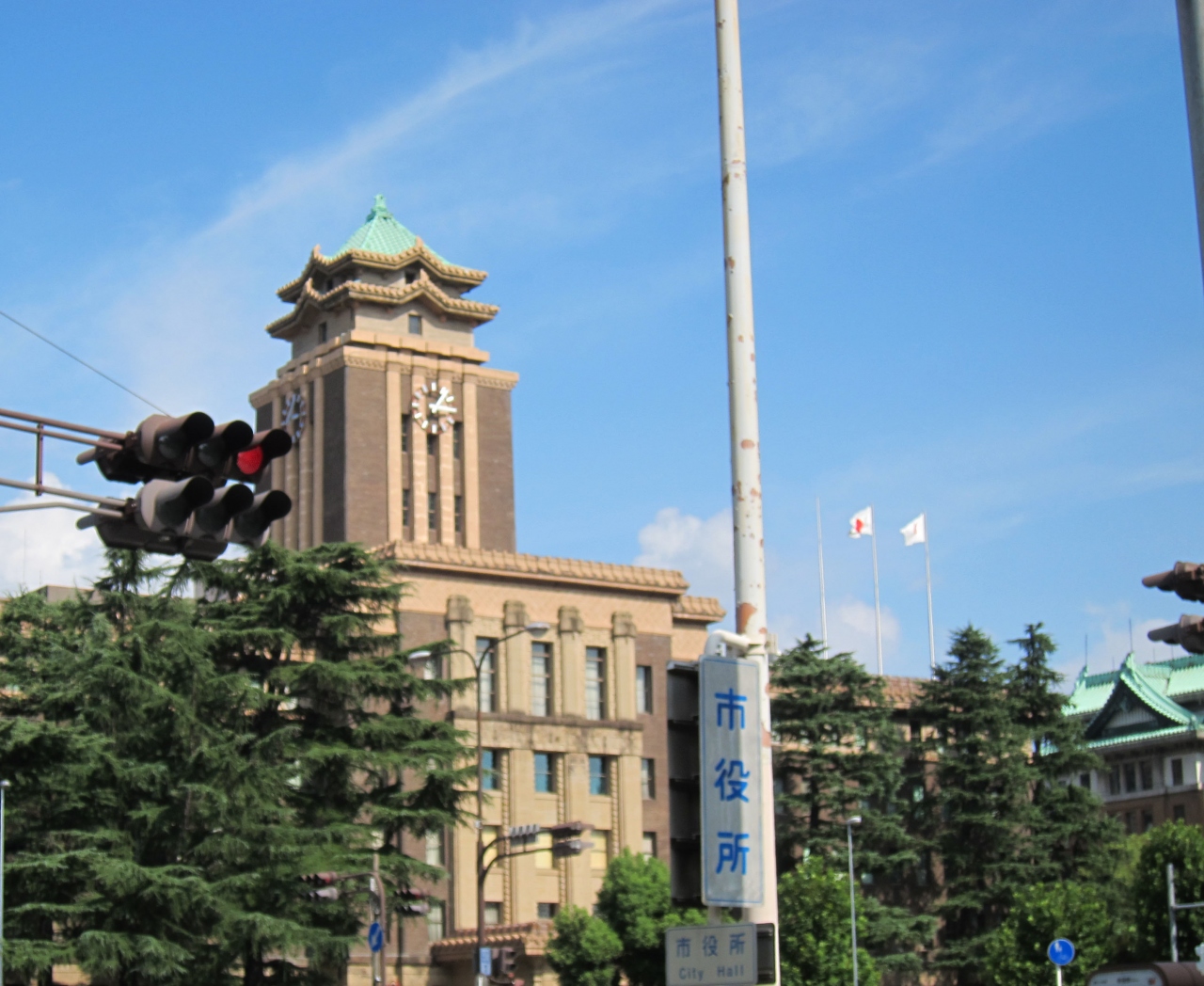 名古屋城の目と鼻の先にあり、名古屋城との調和を図るようにデザインされた昭和8年に建てられた帝冠様式の市庁舎です。塔には二層の屋根があり先端に四方にらみのシャチが乗っています。この庁舎では有形文化財に登録されており、「華麗なる一族」「ステキな金縛り」のロケ地に使われました。