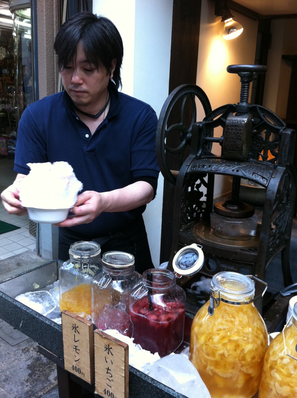 昔懐かしい手回しでかき氷を作っています