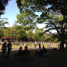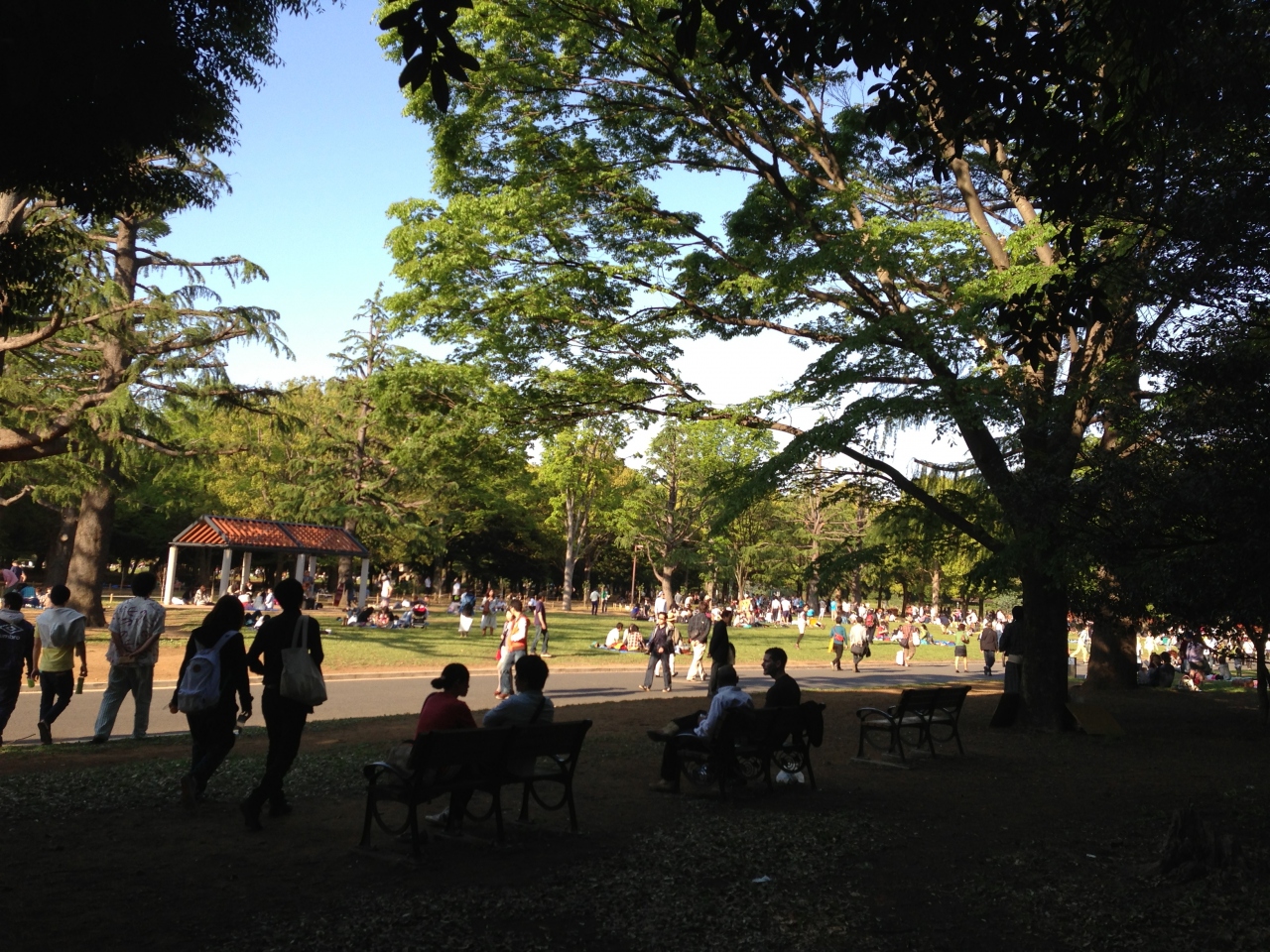 道路を渡り明治神宮に行くと芝生の広場があり、ビニールシートを引いて家族連れやまったりしていたり、若者がフリスビーで遊んでいたりし、かなりいやされました。