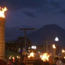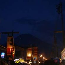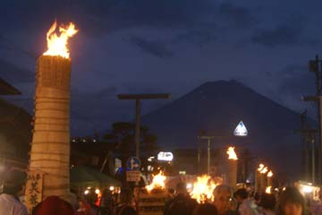 夜の帳が降りると、次々と大松明が点火されていき、よく見ると富士山の吉田口の登山道にも明かりが見えています。人出も多くなって松明の炎も大きくなり祭りは盛り上がます。