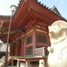 山門をくぐり阿波藩蜂須賀公寄進の四天門をくぐると境内は広々として、正面に重要文化財に指定されている朱色が鮮かな本堂があります。本堂の横には、数珠を手にした大きなタヌキの“蓑山大明神”があります。そのほか、大師堂や四天門、三体堂、千体堂、鐘楼堂など沢山の建物があり、見所の多いお寺さんです。