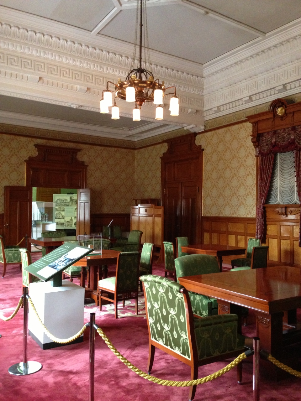 外側は赤レンガと白の花崗岩。ドーム・上屋は緑の銅版・屋根はスレート。