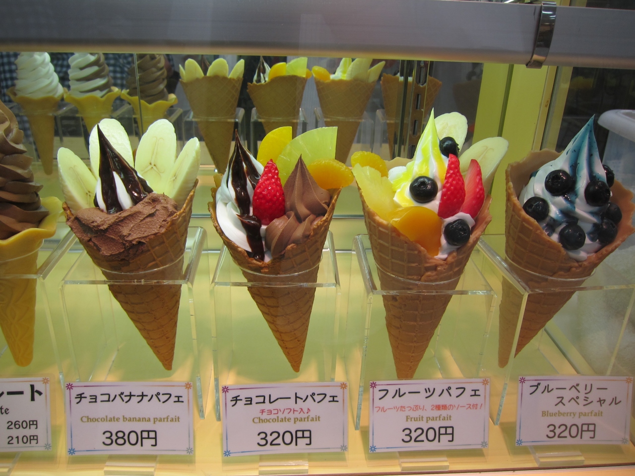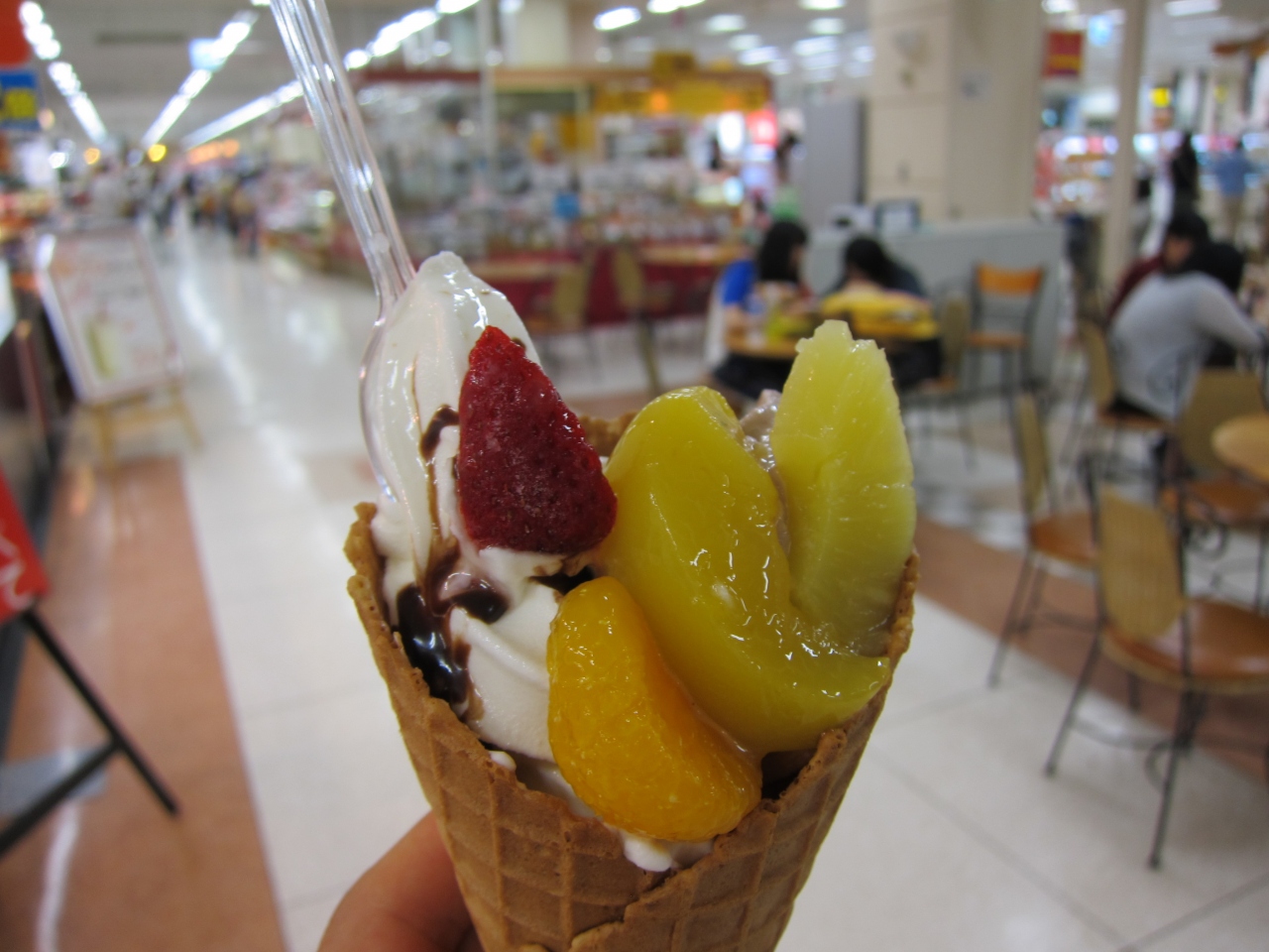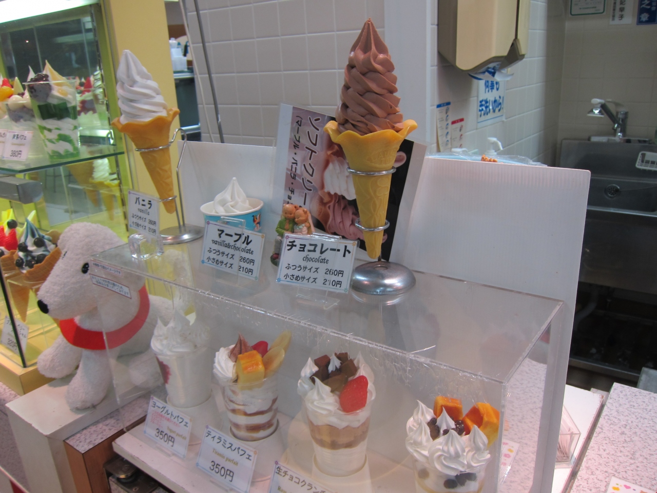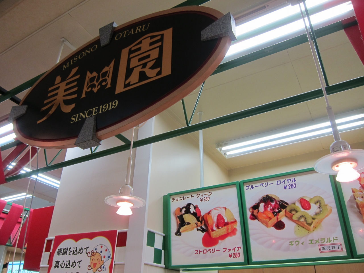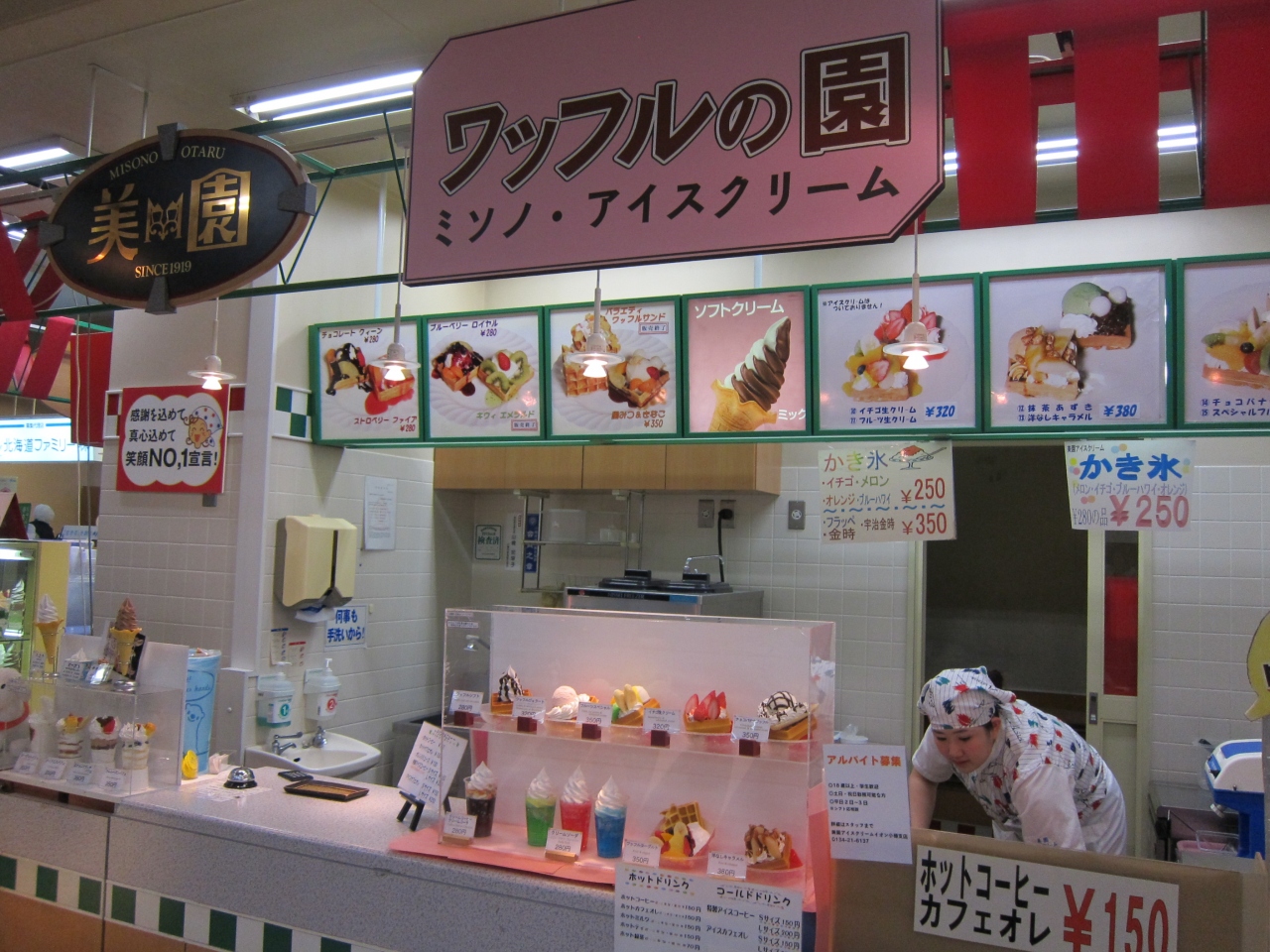 小樽の駅前からのびる中央通り沿いにある美園アイスクリームの小樽ウイングベイ支店です。1階のAEONの店内に入っています。食料品売り場に続くフードコート風の店舗で、売り場の前に椅子やテーブルが並んでいます。ちょっと騒がしいかもしれませんが、老舗の味を気軽な感じで買い物ついでに休憩しながら堪能できます。