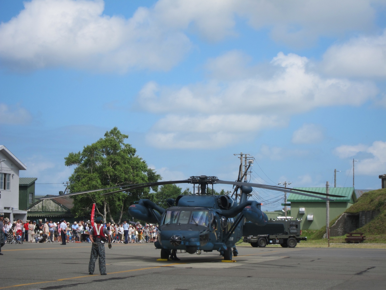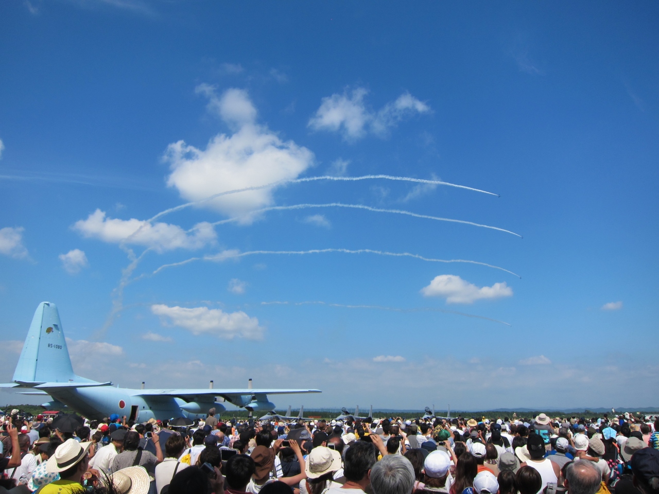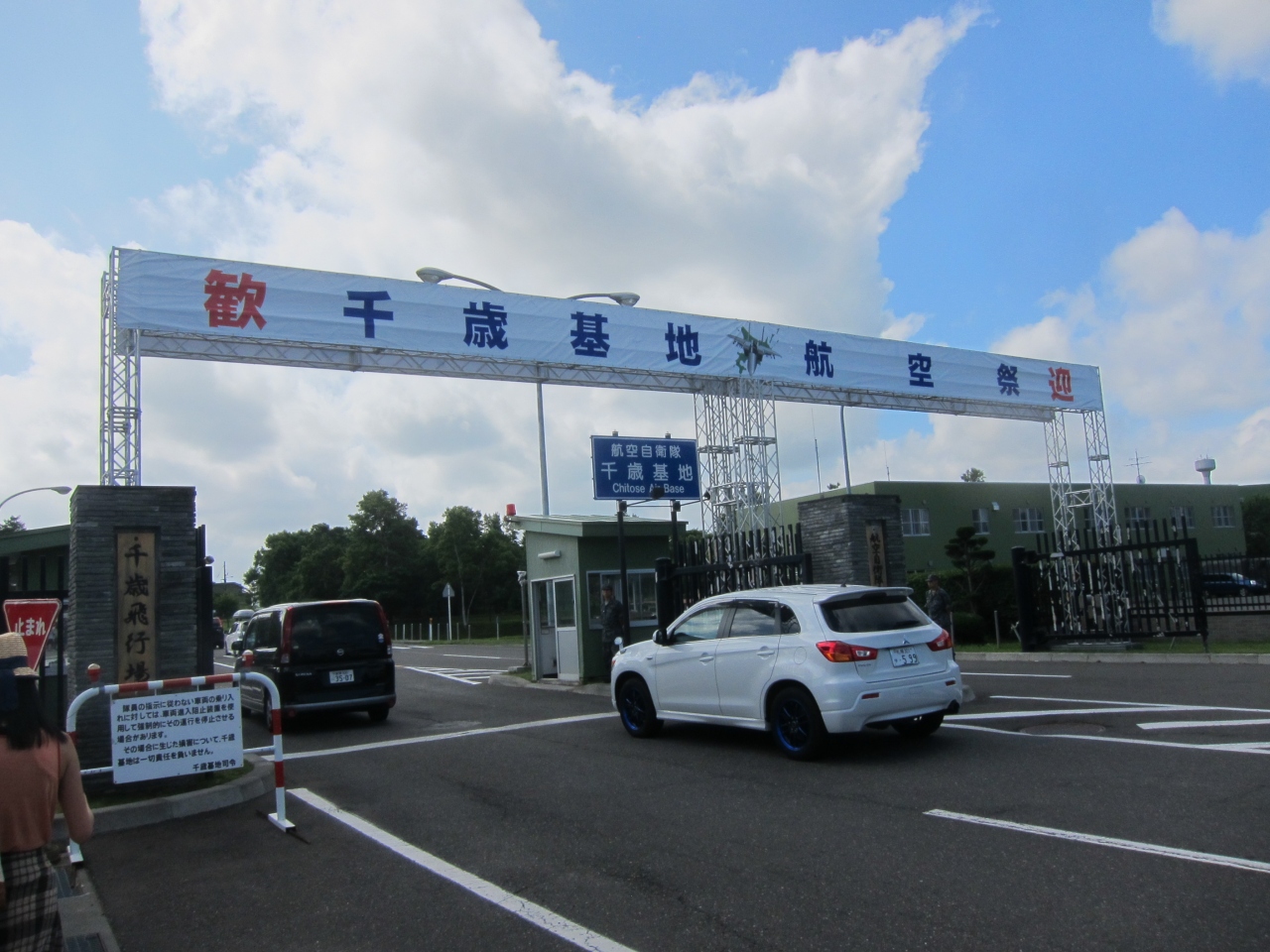 4名以上で申し込めば、予約の上、無料で見学できるそうですが(土日祝日、年末年始を除く)、千歳基地最大のイベント、航空祭の時に入りました(毎年8月の初めごろに開催)。当日は4万人の人手(2013年)と、広い会場も賑やかを通り越して大変な混雑。9時少し手前から始まりましたが、周辺の道路は大渋滞。当日のみJR千歳駅(または南千歳)から基地内まで入る200円の連絡バスがありますが8時過ぎのバスでは途中から全く動きませんでした。皆、途中で降りて歩きましたが、バスよりはるかに早く到着です(最初から歩いた方が早かった)。バスは7時30分から動いているようなので、場所取りを含めて早めに行くか、千歳駅から2kmほどある会場まで歩き等で向かうしかないのかもしれません(帰りは途中、らーめん屋、焼肉屋、スイーツのLeTAOなど楽しめます)。会場では自衛隊グッズ(服やキャップ、お菓子など多数)やB級グルメの露店が多数。車を運転していなければ禁酒ではないようで、冷たいビールも販売していました。大きな格納庫を休憩所にしていましたが、その他は晴れて北海道とはいえ炎天下でした。特に駐機の眺めのよい前列や人気の露店での順番待ちはつらく、日よけ・日焼け対策が必要です。またちょっとした脚立があると見やすいかもしれません(高すぎると後方からクレームがきそう)。観覧のほか、格納庫以外での食べ物を食べながらの休憩のため、敷物もほしいところです。