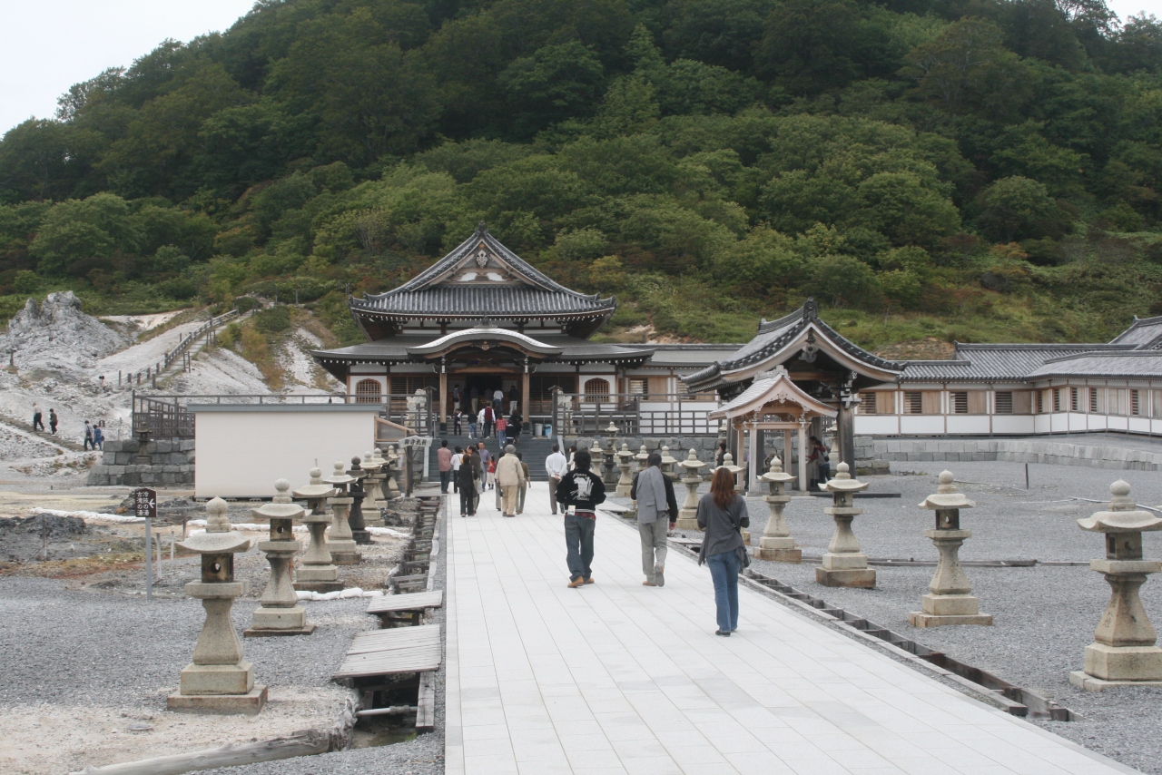 総門、山門と過ぎて奥に進むと、本尊安置の地獄殿があります。その少し手前には男女別の湯殿があります。地獄の手前で乳白色のお湯に浸かって、極楽!極楽!といったところでしょうか。左手には硫黄の臭いがきつい、荒涼とした地獄めぐりが拡がっています。